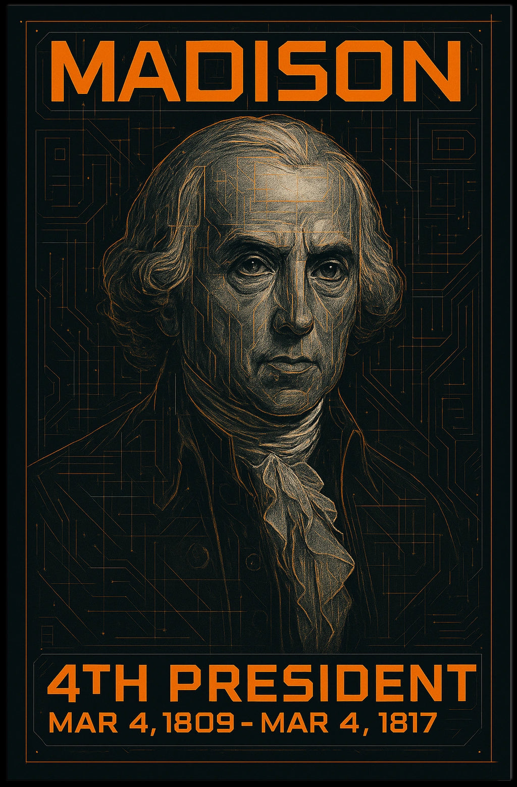 Enhance any space with a poster that honors american politics, history, and the enduring legacy of James Madison. This wall art makes an ideal gift for students, teachers, and collectors who appreciate the fusion of classic portraiture with modern design.