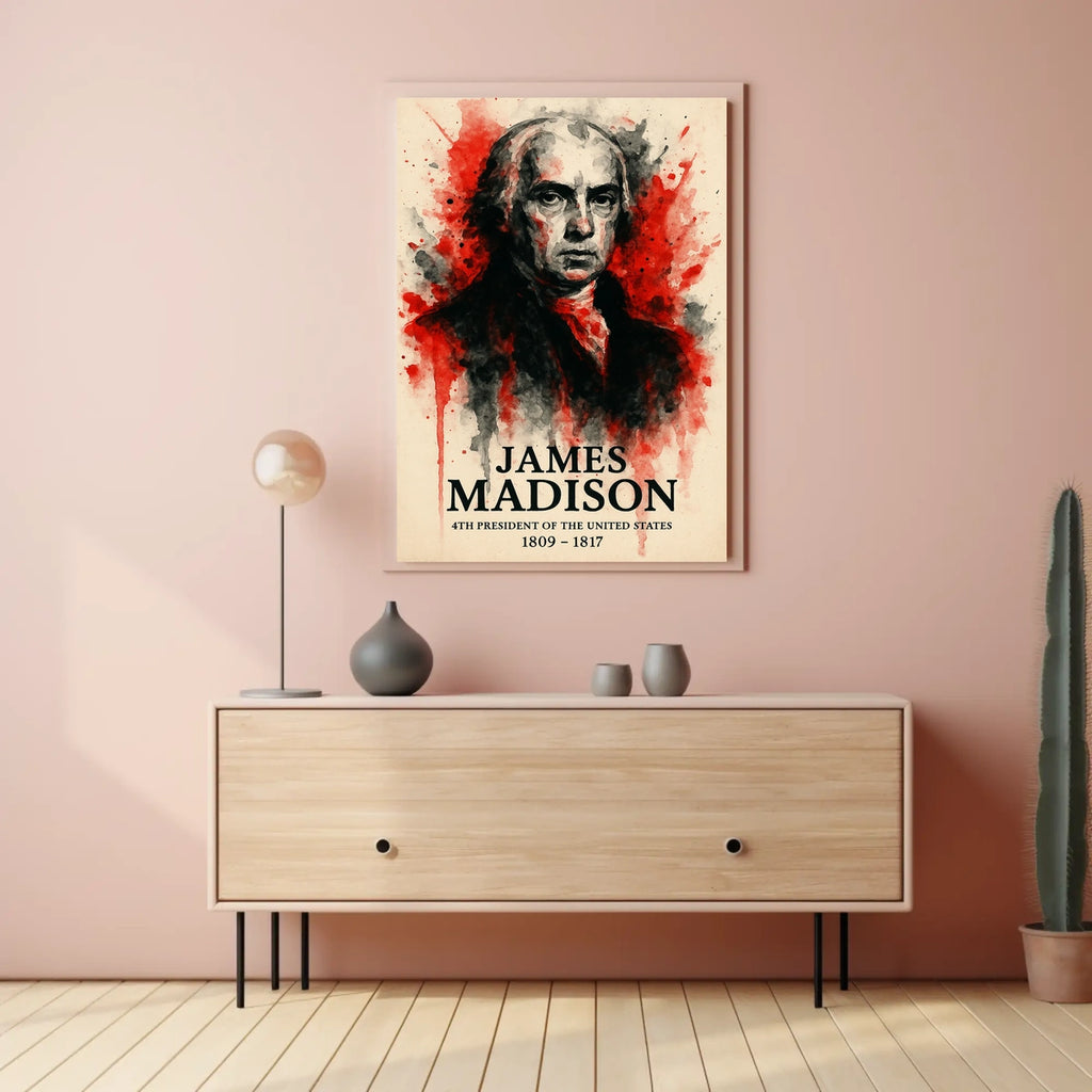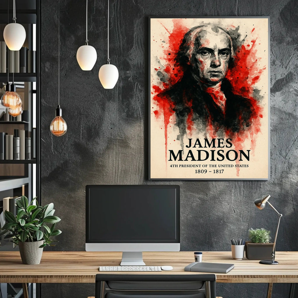 Celebrate America's history with this striking watercolor-style portrait of James Madison, the nation's 4th President. This poster captures the elegance and service of Madison's presidency from 1809 to 1817, ideal for history buffs and art enthusiasts alike. The artwork features a unique blend of bold watercolor strokes, enhancing the classic allure of this notable leader. Whether decorating an office, study, or living space, it serves as both an educational piece and a timeless tribute to American heritage. Engage in a journey through history while adding visual sophistication to any room.