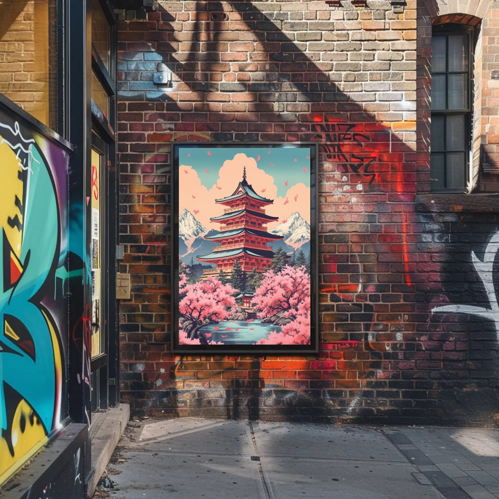 Enhance your home & garden decor collection with a poster that tells a story—order the Japanese Pagoda Cherry Blossoms Heritage Poster from PosterGoat today and bring tranquil nature and timeless tradition to your walls.