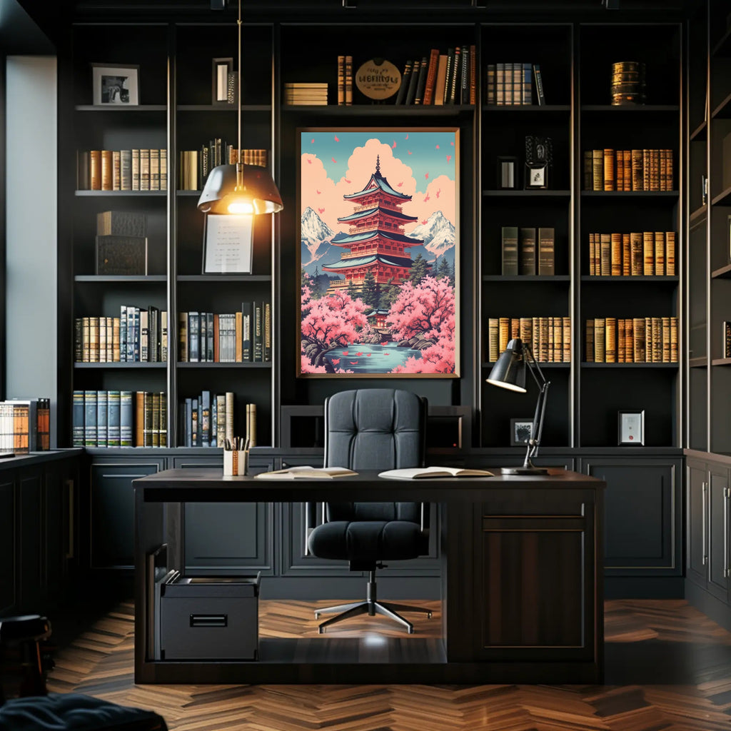 Transport your space to the heart of rural Japan with the Japanese Pagoda Cherry Blossoms Heritage Poster by PosterGoat. This striking artwork blends traditional Japanese pagoda architecture, lush cherry blossom trees and a serene reflective pond into a dreamy, surreal composition that brings calm and cultural charm to any room.