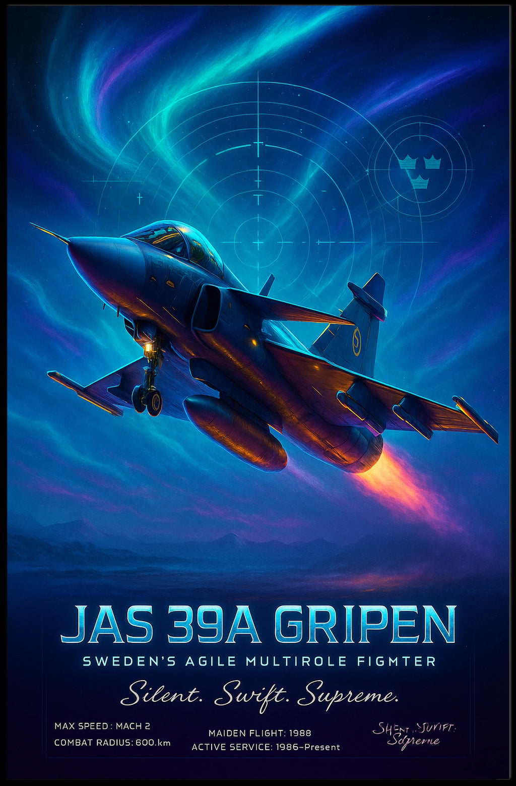 Hey there, if you're a fan of aviation history or just love sprucing up your space with cool art, this JAS 39A Gripen poster is a fantastic pick! It's all about that agile multirole fighter from Sweden, brought to life in stunning digital painting or photography realism styles. Imagine adding a touch of adventure to your living room or office—it's super easy to hang and instantly makes any wall feel more exciting.