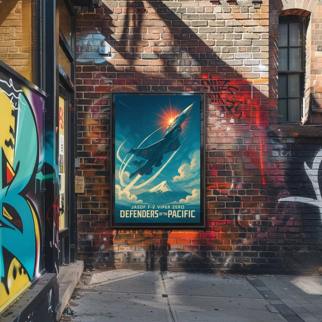 Capture the spirit of modern aviation with the JASDF F-2 Viper Zero Defenders Poster from PosterGoat — a bold, mid-century inspired print that celebrates the power and precision of Japan’s F-2 fighter jet.