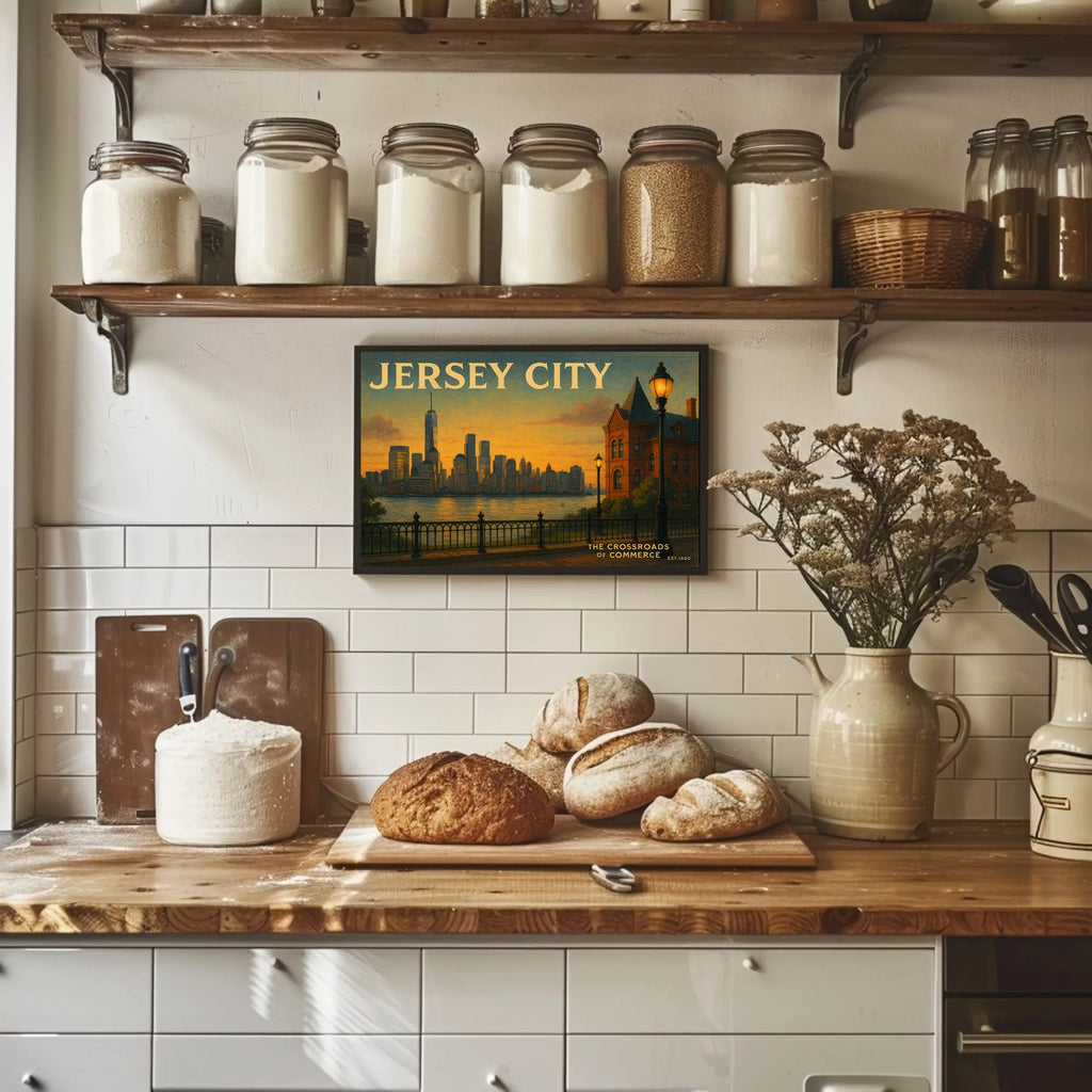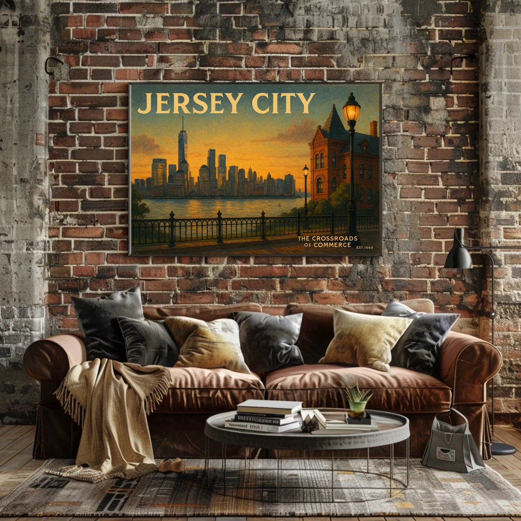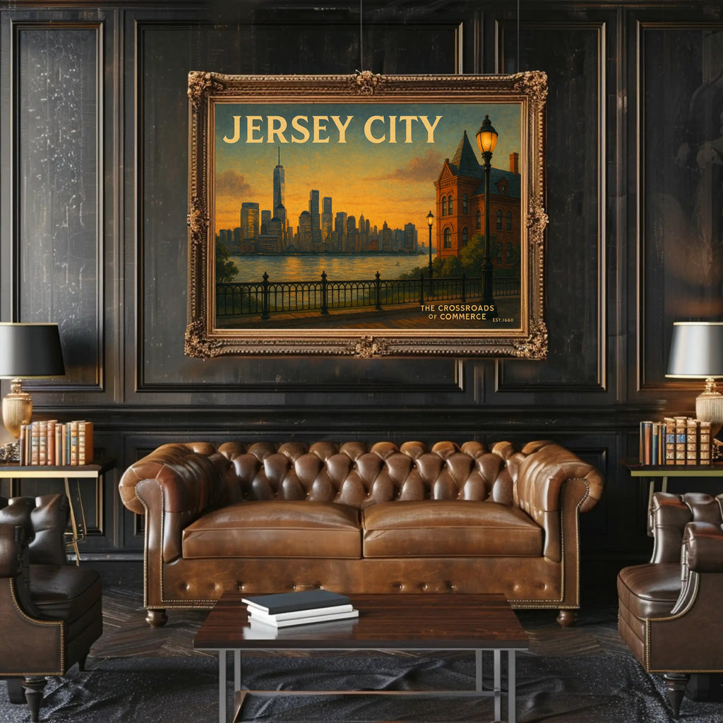 Add a cinematic touch of city romance to your walls — order your Jersey City Skyline Sunset Travel Poster from PosterGoat today and transform any space with warm sunset vibes and timeless urban charm.