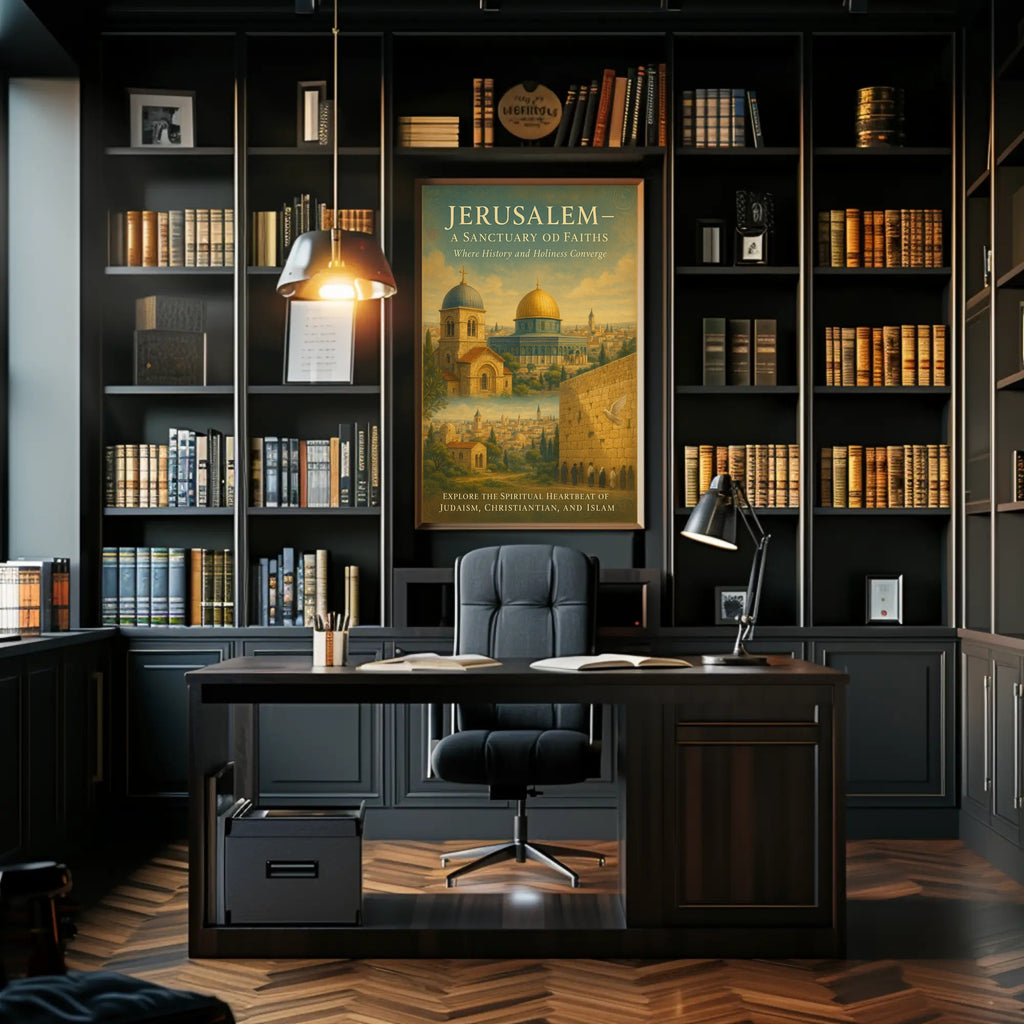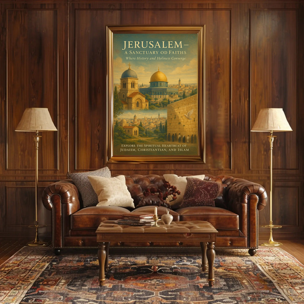 This print creates a serene, contemplative mood: a golden dome framed by historic stonework, a quiet procession at the Western Wall, and a single dove in flight—all composed to evoke unity and the layered cultural heritage of Jerusalem. The poster’s classic typography and subtle ornamental detailing make it a refined focal point for living rooms, study spaces, prayer rooms, or gallery walls.
