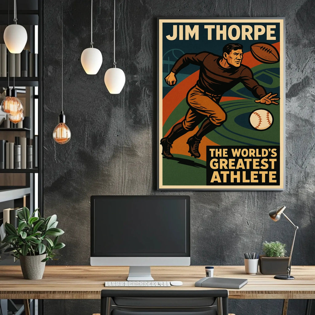 Celebrate the enduring legacy of Jim Thorpe with this striking poster that blends bold artwork with timeless appeal. Designed for sports fans and history buffs alike, it highlights Thorpe’s legendary versatility and achievements across football and baseball, making it a centerpiece for any room.