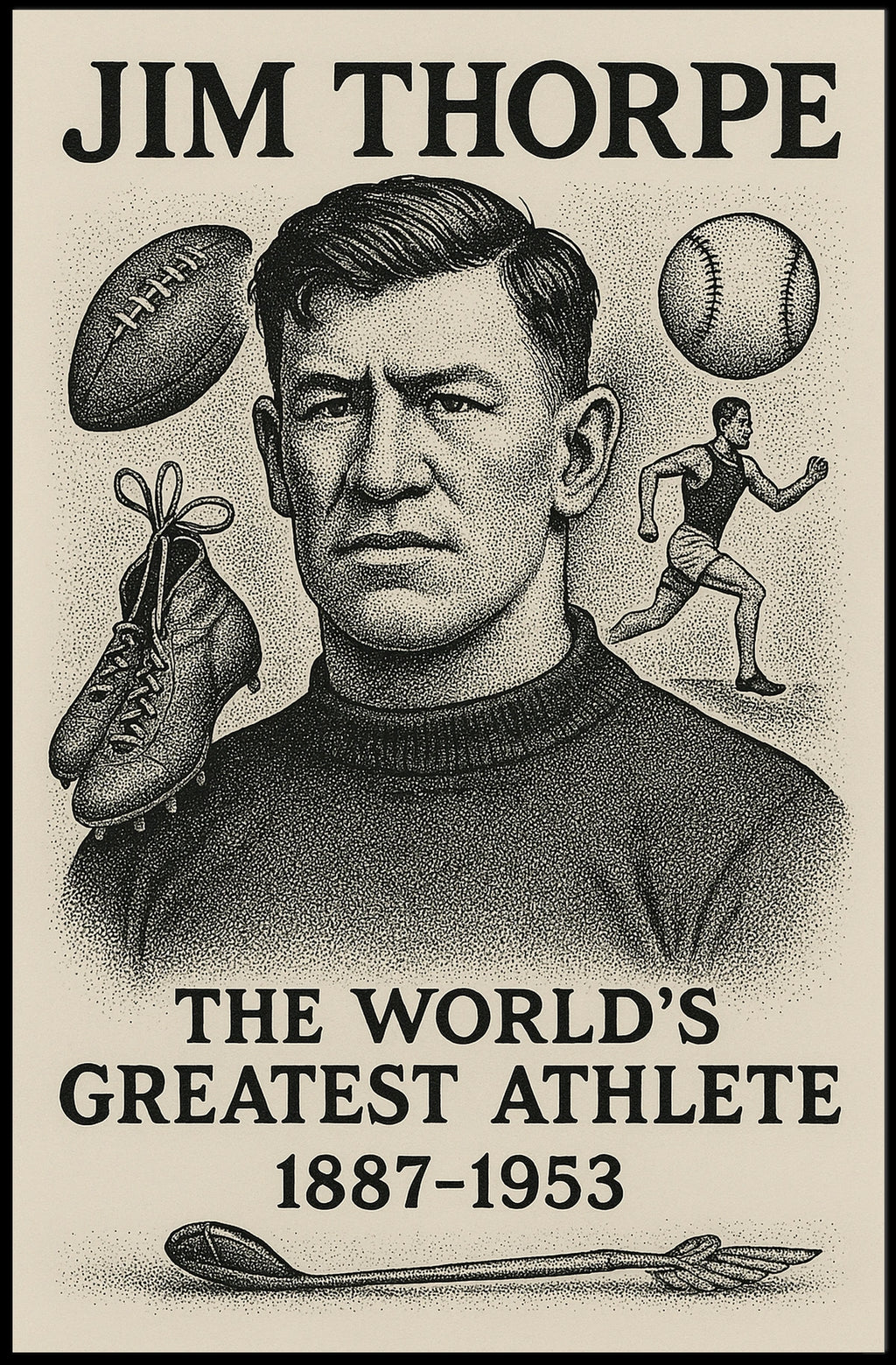 Iconic portrayal of versatility — This poster spotlights Thorpe's mastery across multiple sports, turning a single artwork into a powerful testament to adaptable greatness.