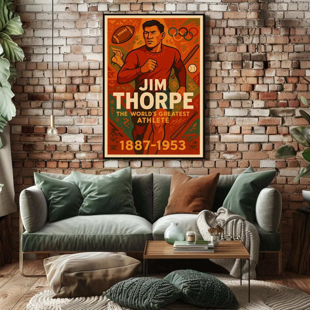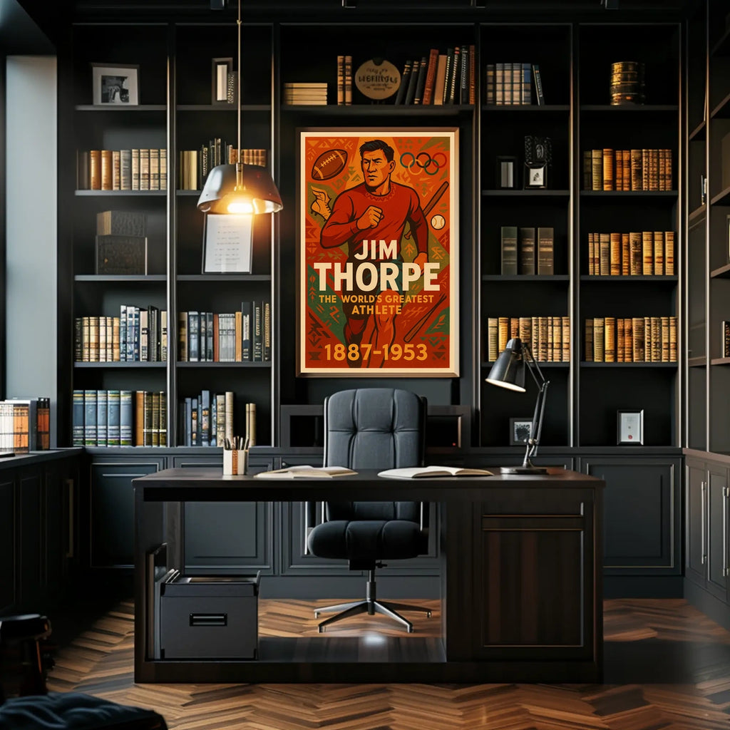 Celebrate Jim Thorpe, a true legend whose career spanned 1887–1953, with this captivating poster. This tribute to the World's Greatest Athlete blends bold imagery with historic achievement, creating a striking centerpiece for fans of sports history and decorative art. Perfect for living rooms, offices, or study walls, it brings inspiration, conversation, and timeless athletic pride to any space.