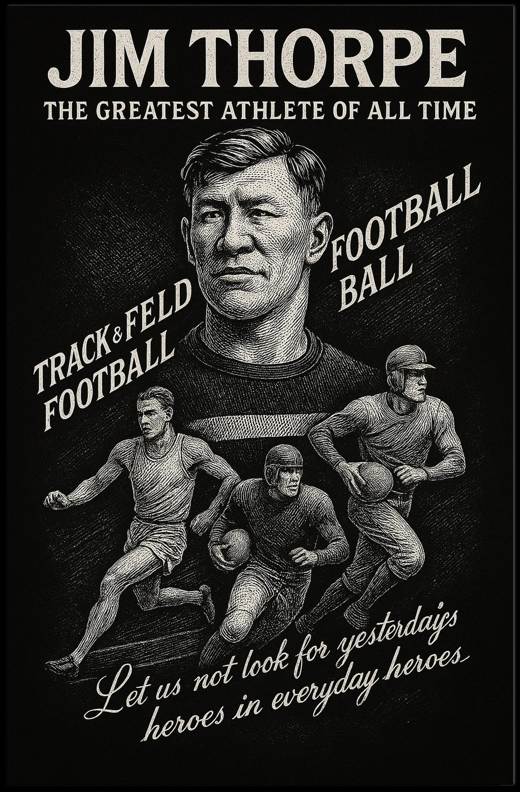 Iconic portrayal of a sports history icon highlights Thorpe's multi-sport prowess, reinforcing inspiration for achievement in everyday life.