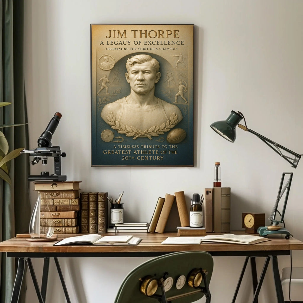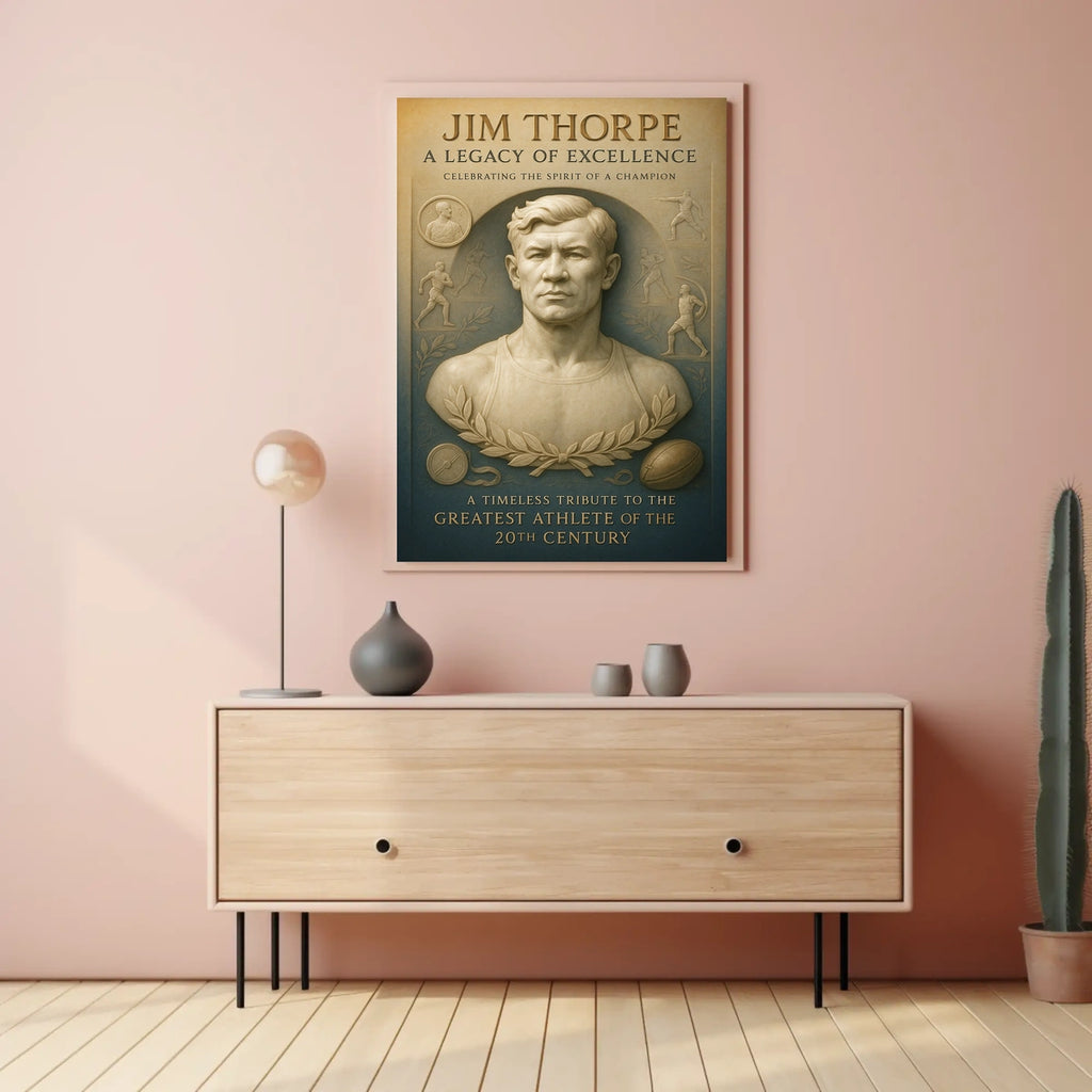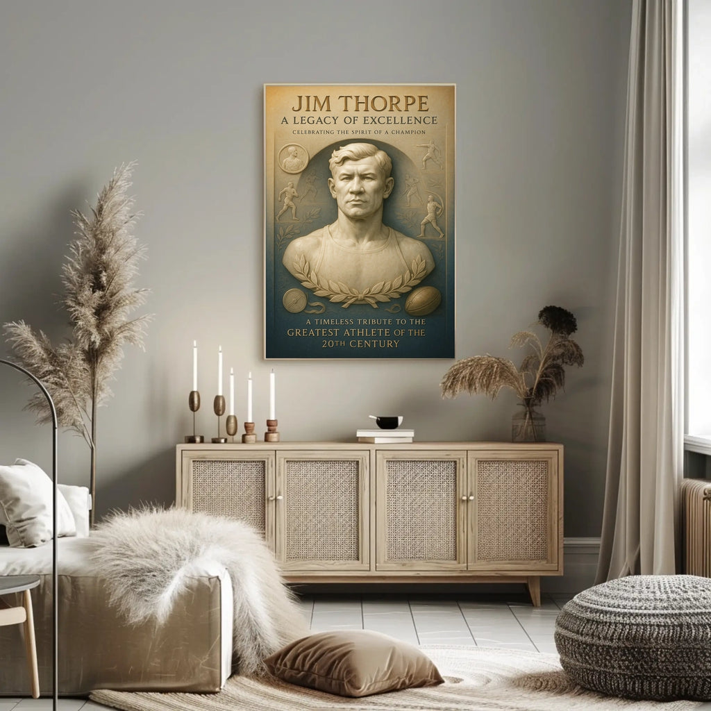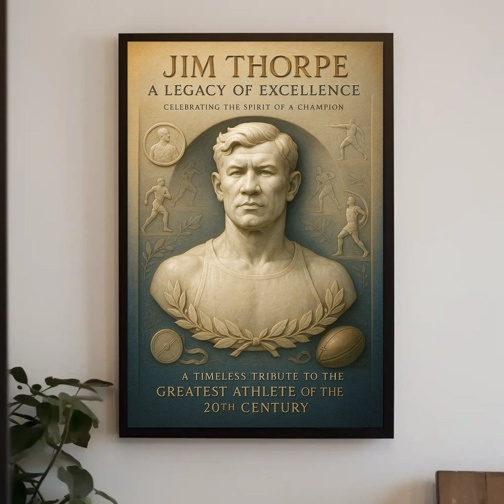 Celebrate the legendary Jim Thorpe with this stunning poster, designed to inspire greatness in any space. It captures the essence of his remarkable athletic achievements and enduring legacy for sports fans and history buffs alike.
