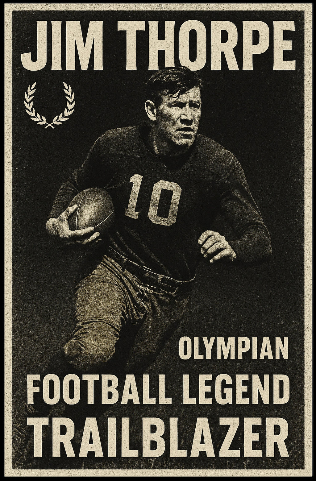 Honor the legacy of Jim Thorpe with this striking poster that celebrates his Olympic triumphs and his Olympian achievements in football. A bold tribute for sports history lovers, classrooms, or any space seeking inspiration from one of athletics' greatest icons.