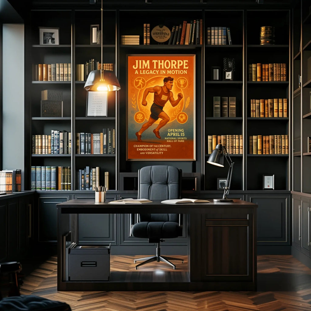 Celebrate the extraordinary achievements of Jim Thorpe with this striking poster, a heartfelt tribute to a century-defining champion. Timeless in theme and rich in history, it honors a true sports legend and complements the National Sports Hall of Fame exhibit opening April 15.