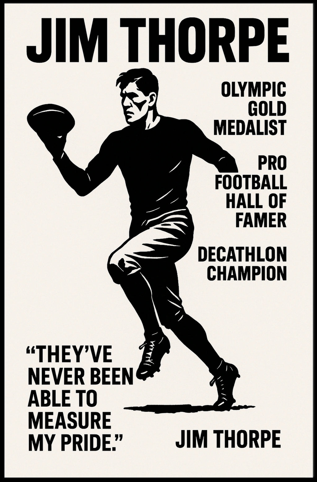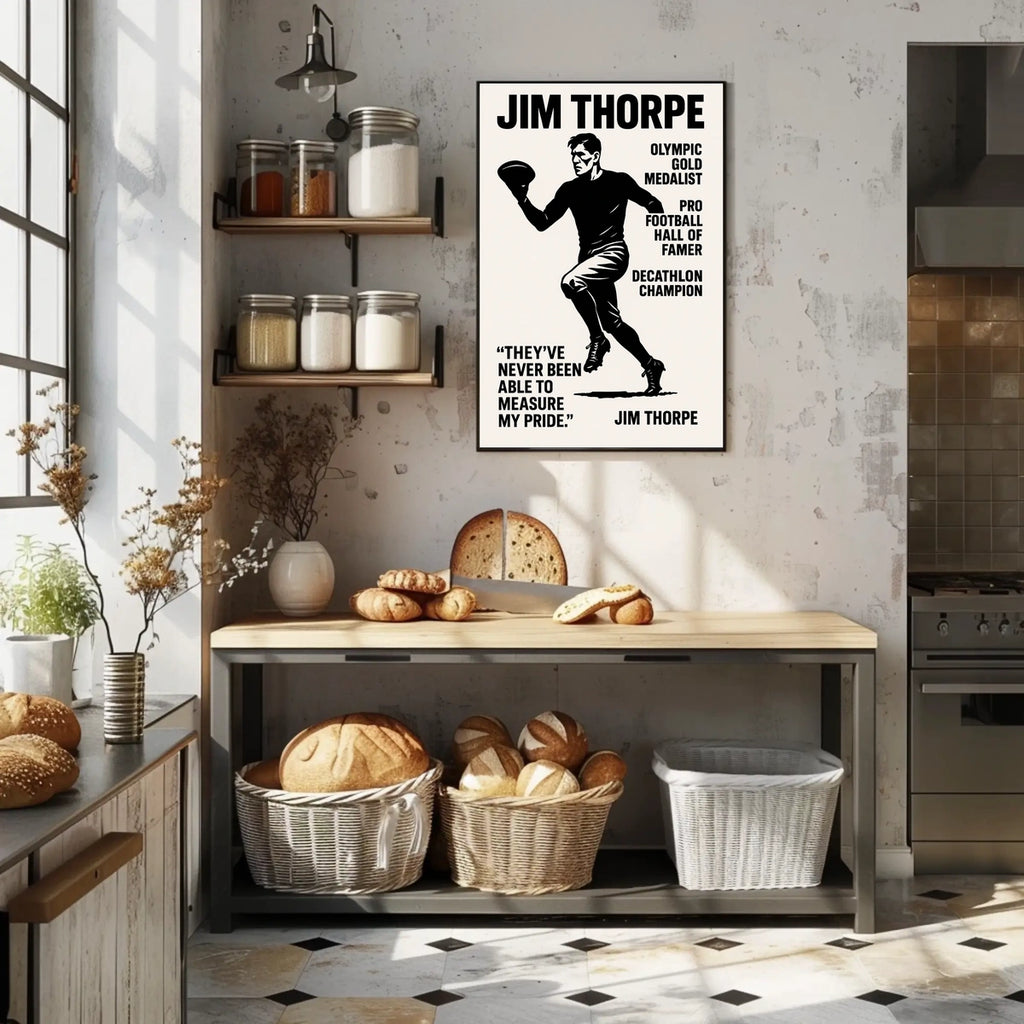 Celebrate the enduring legacy of Jim Thorpe with this striking poster, a tribute to athletic genius and trailblazing achievement. Its bold silhouette and inspirational quote capture the energy of his historic feats, making it a compelling centerpiece for any history or sports enthusiast's space.