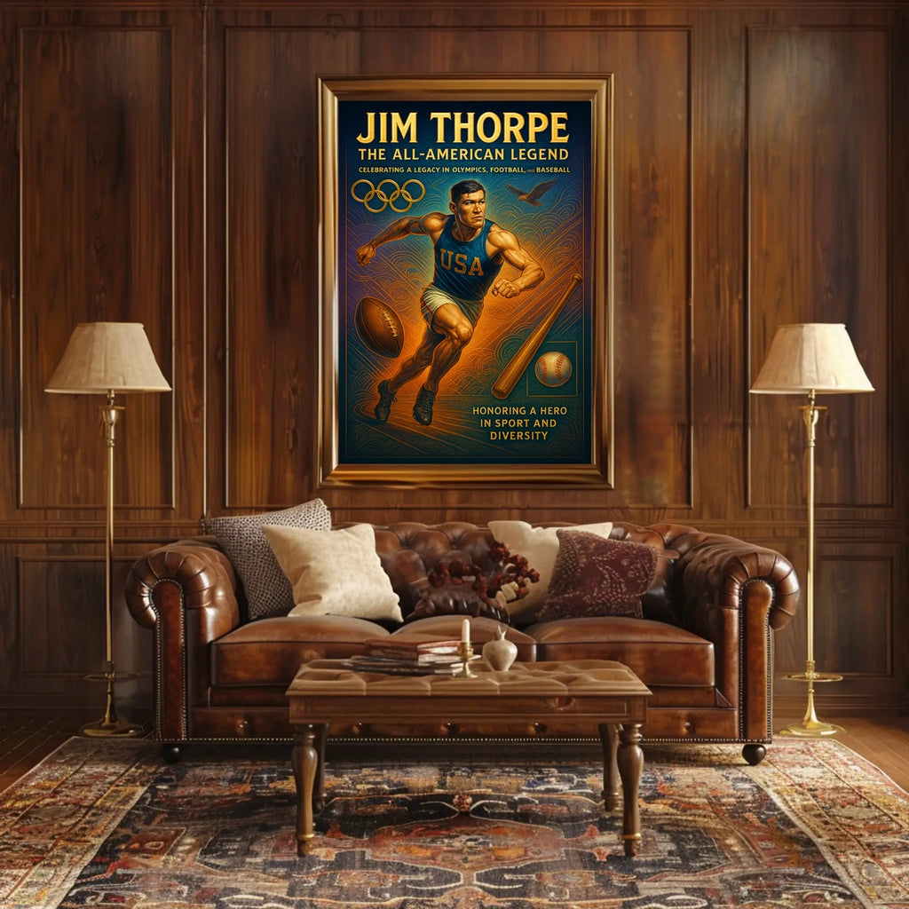 Celebrate the extraordinary legacy of Jim Thorpe with this striking poster—a bold tribute to an all-American trailblazer whose impact spans Olympics greatness, football prowess, and baseball skill. This piece blends historical significance with inspiring art, making it a centerpiece for any sports room or study.