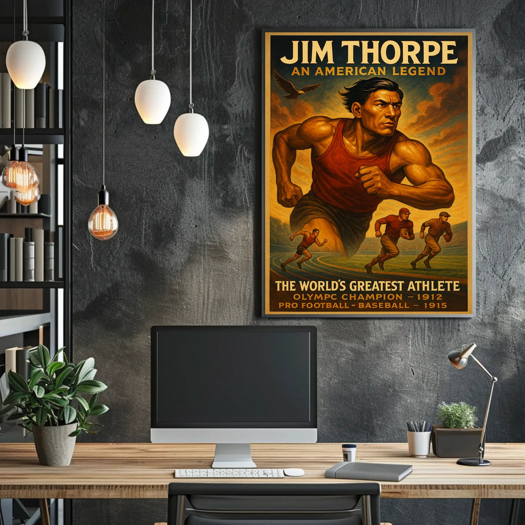 Iconic design and vibrant print: Archival inks and sharp lines make Jim Thorpe’s legend pop on any wall, creating a striking focal point that energizes spaces.