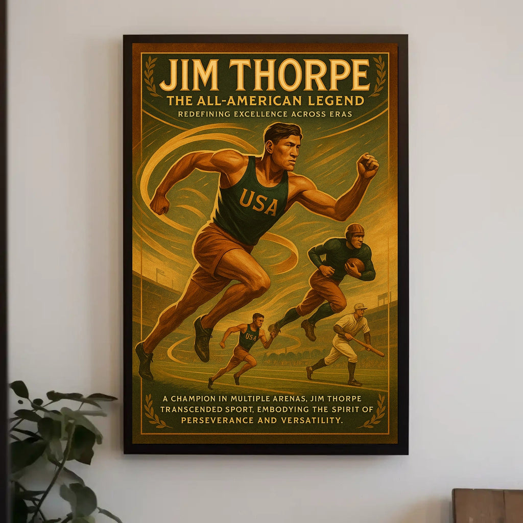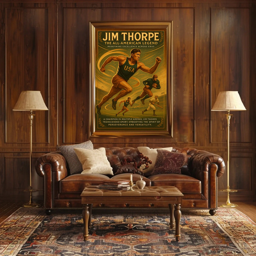 - Iconic portrayal of a historical sports figure — a striking homage to Jim Thorpe’s all-around athletic prowess that motivates daily performance and ambition.