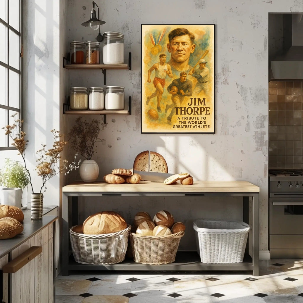 Iconic multi-sport tribute: Celebrates Thorpe’s track, football and baseball prowess, fueling motivation and conversation with a single, powerful image.