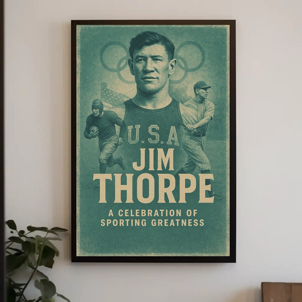 Iconic imagery that honors a legend: A bold design captures Jim Thorpe's cross-discipline genius, making sports history feel immediate and inspiring in any room.