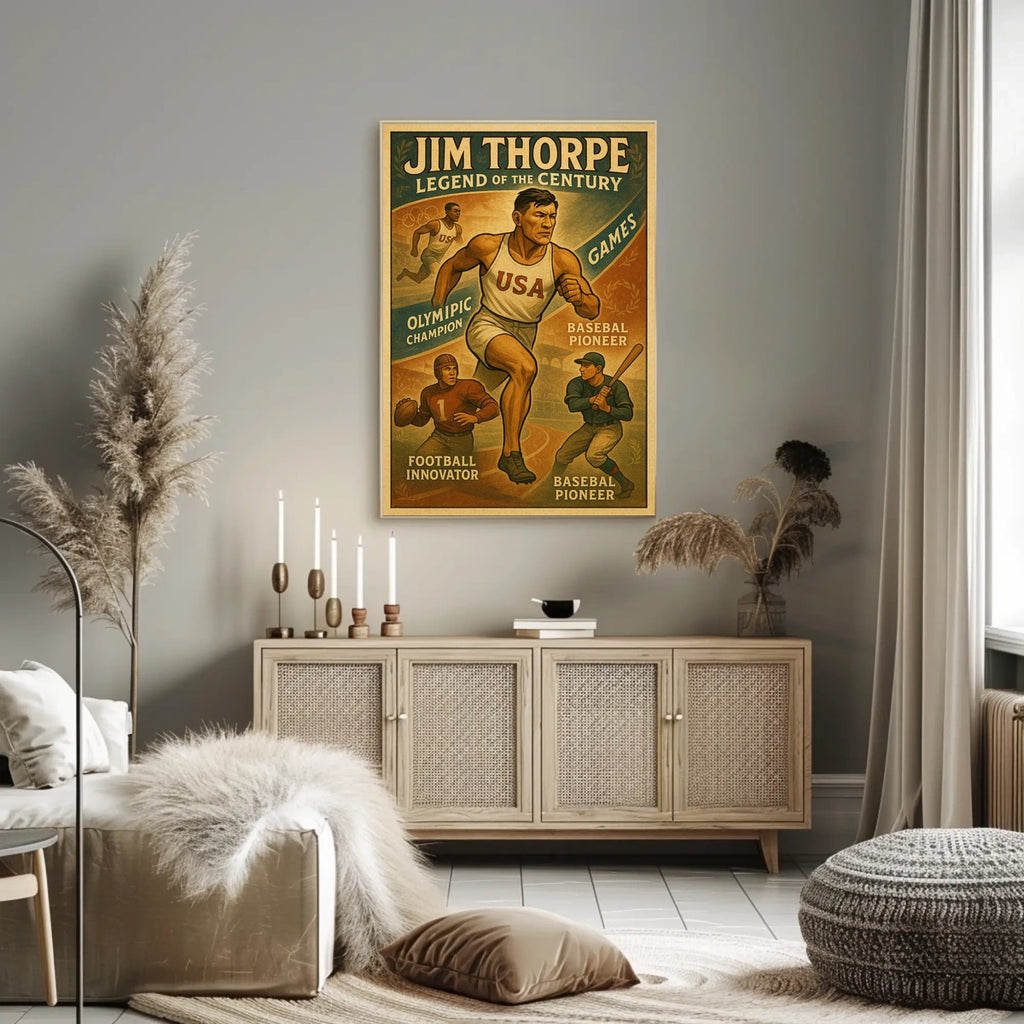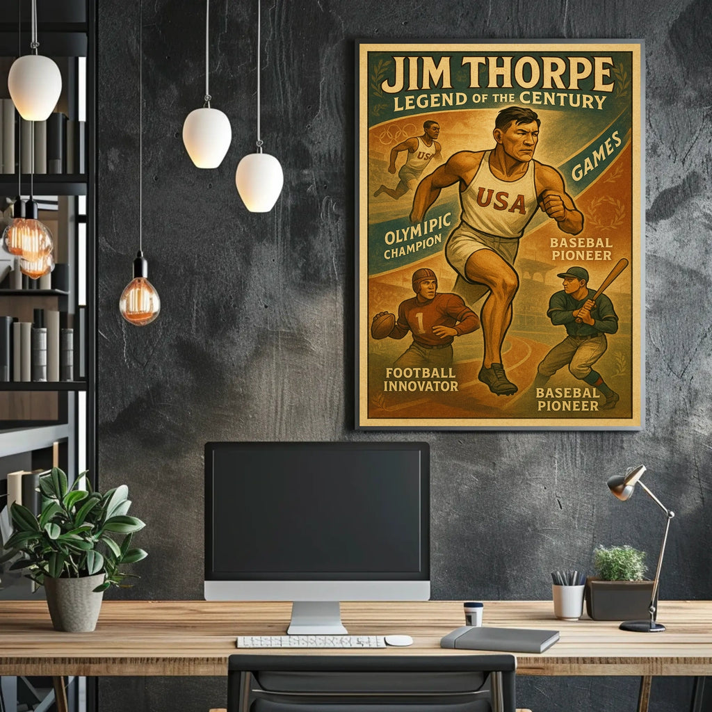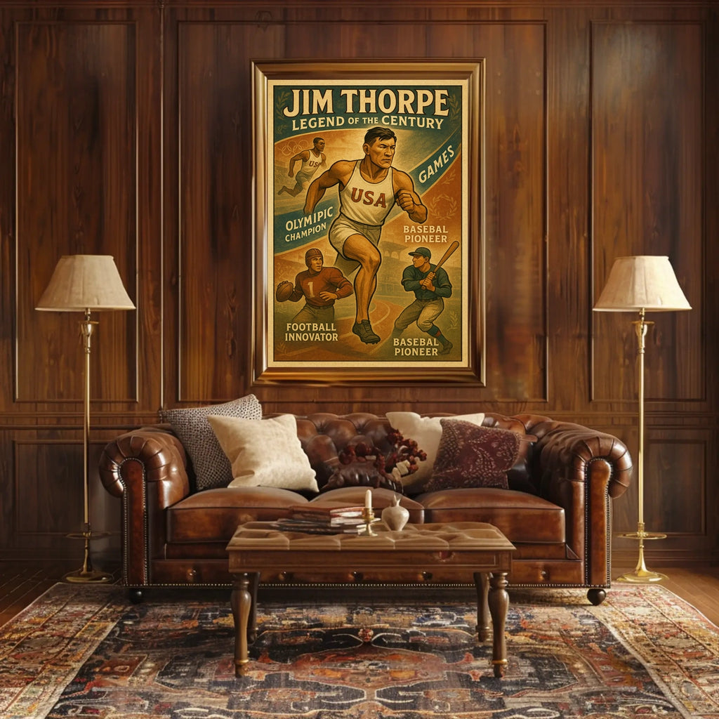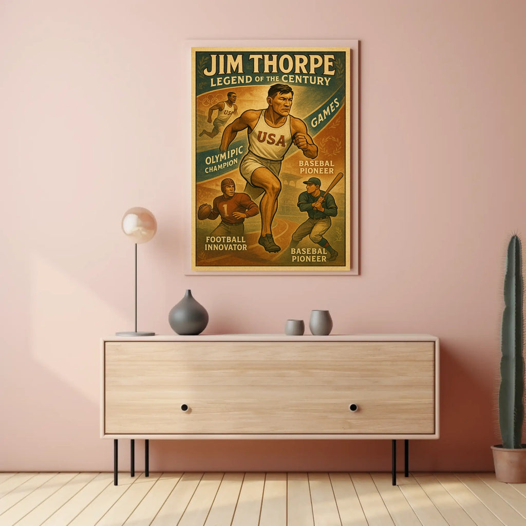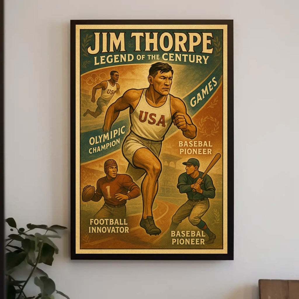 Celebrate the renowned versatility of Jim Thorpe with this vintage-inspired poster. Designed for sports lovers and history enthusiasts, it captures the spirit of a legendary athlete and brings a timeless narrative of grit and achievement to any wall.