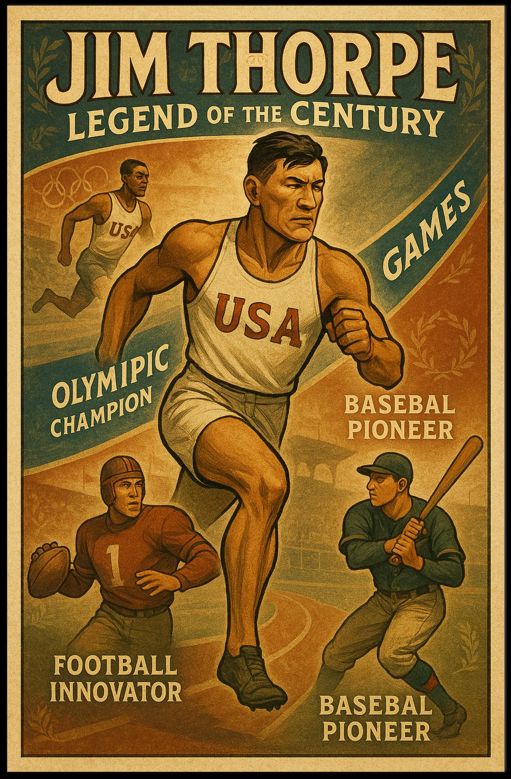 Celebrates legendary versatility – Highlights Thorpe's multi-sport greatness, appealing to fans of Olympic history and the broader athletic legacy.