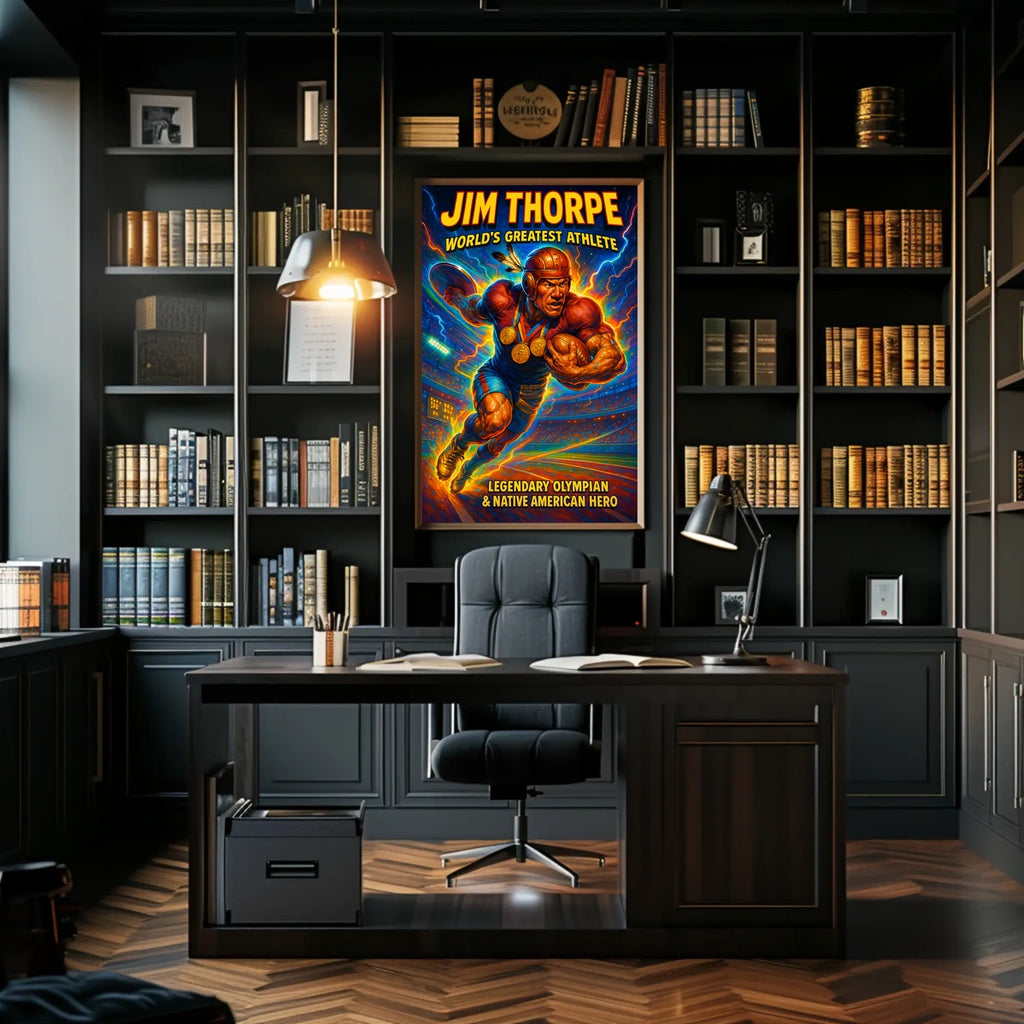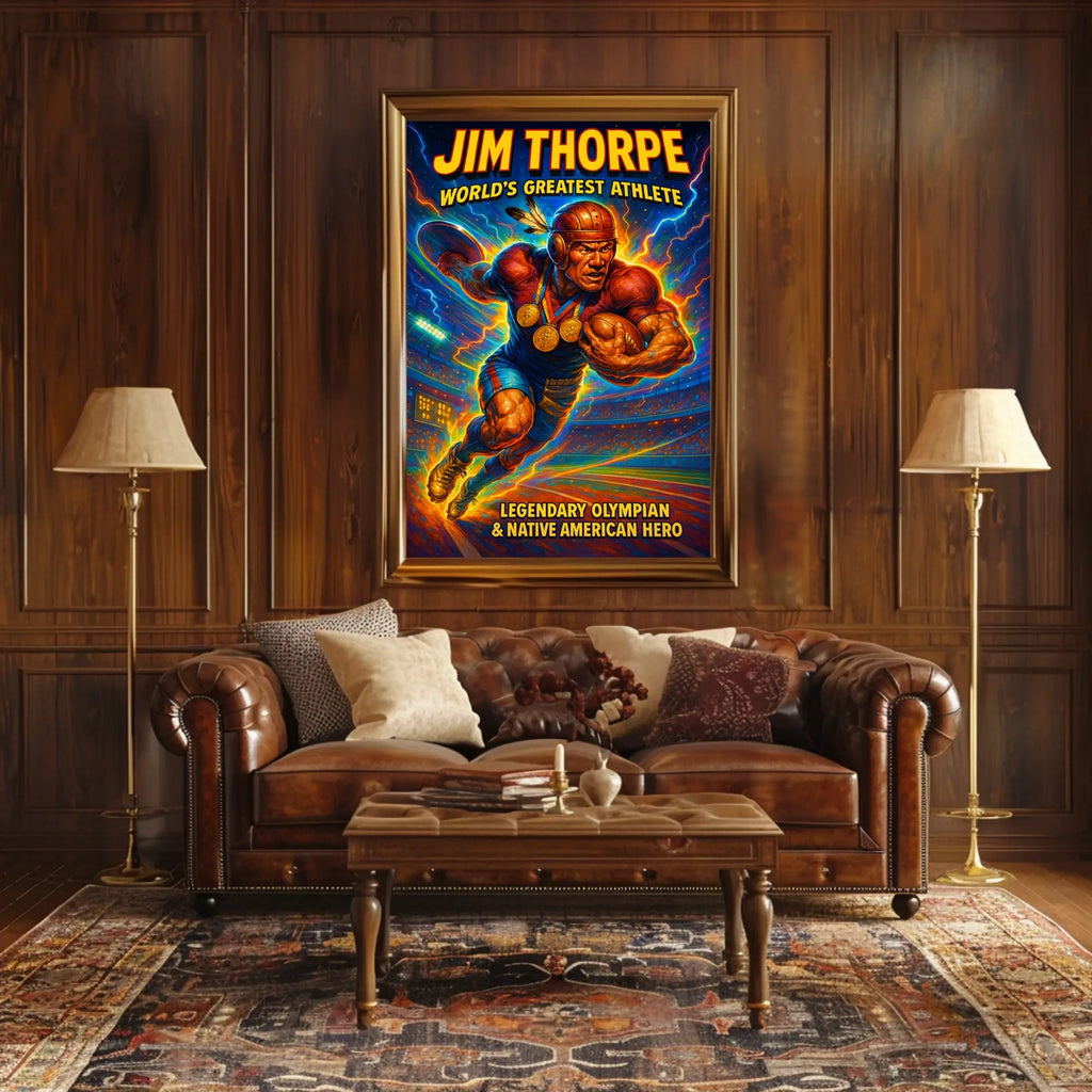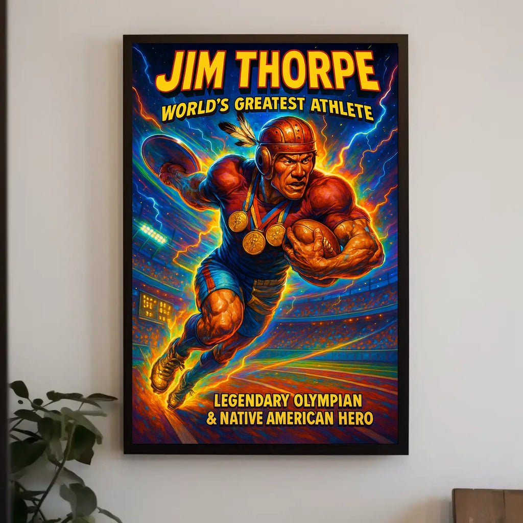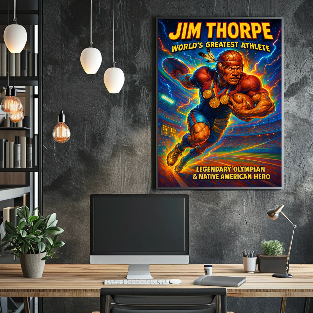 Iconic portrayal of Jim Thorpe — a bold tribute to a legendary Olympian that sparks daily motivation and conversation.