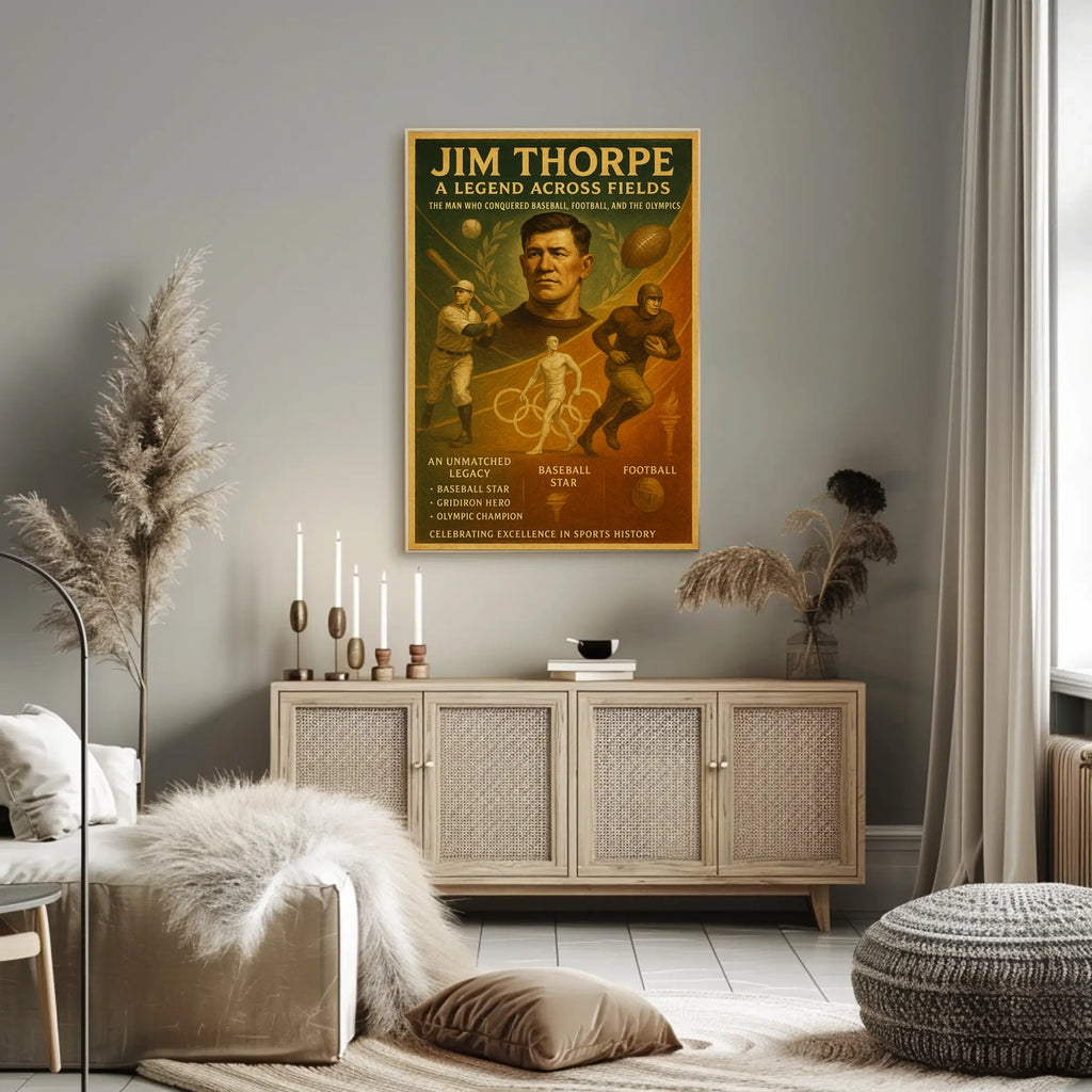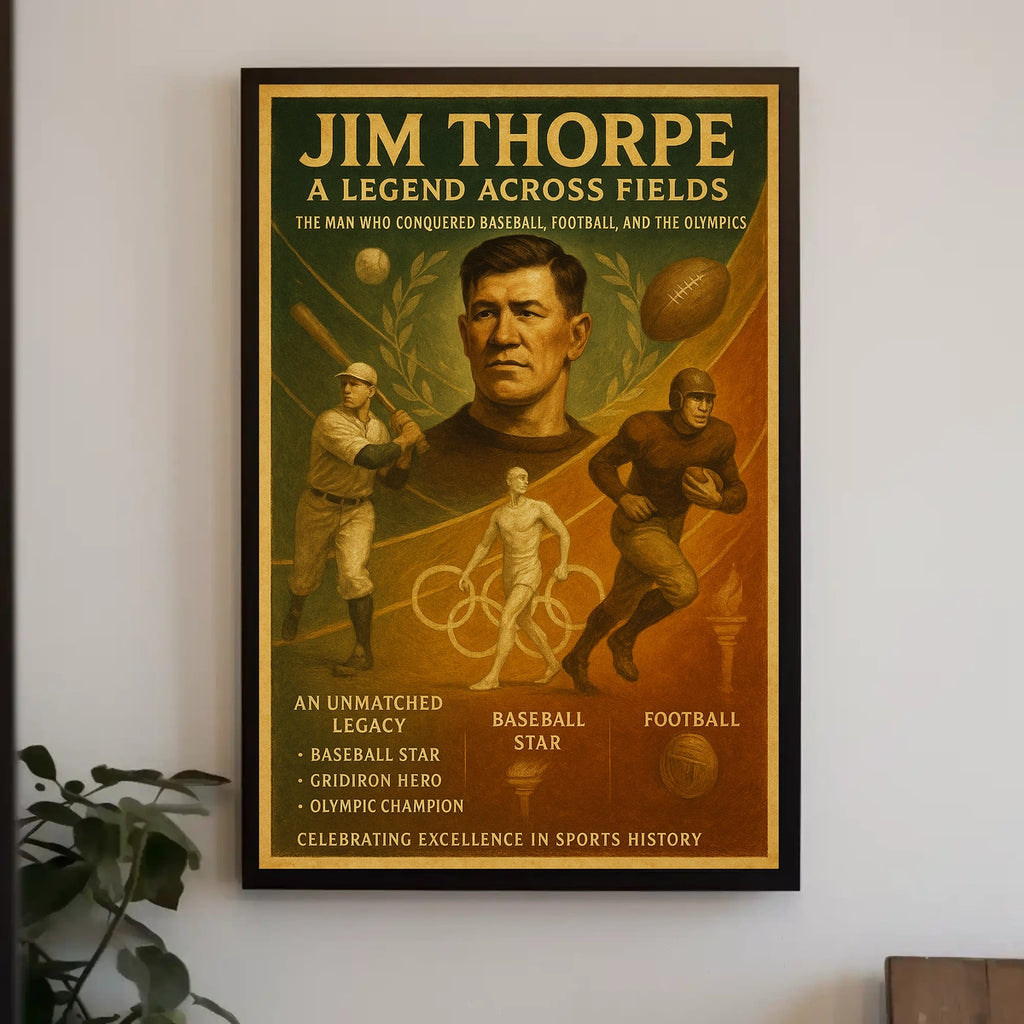 Celebrate the legacy of Jim Thorpe, a legendary athlete who excelled in baseball, football, and as an Olympic champion. This poster captures his versatile talent and enduring appeal, making it a powerful addition for sports history lovers and anyone inspired by greatness.