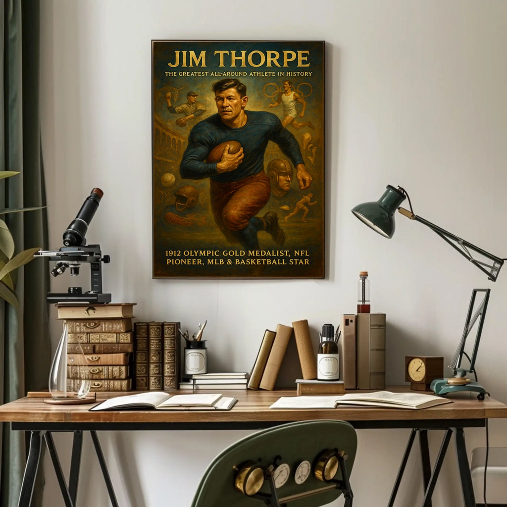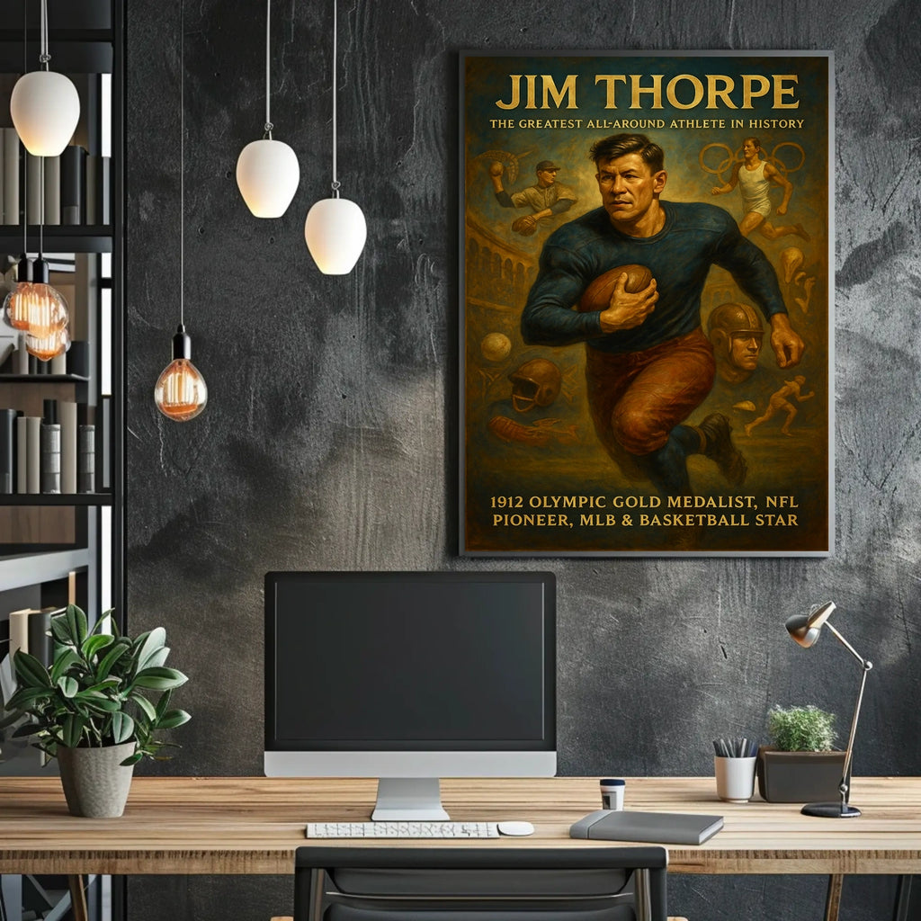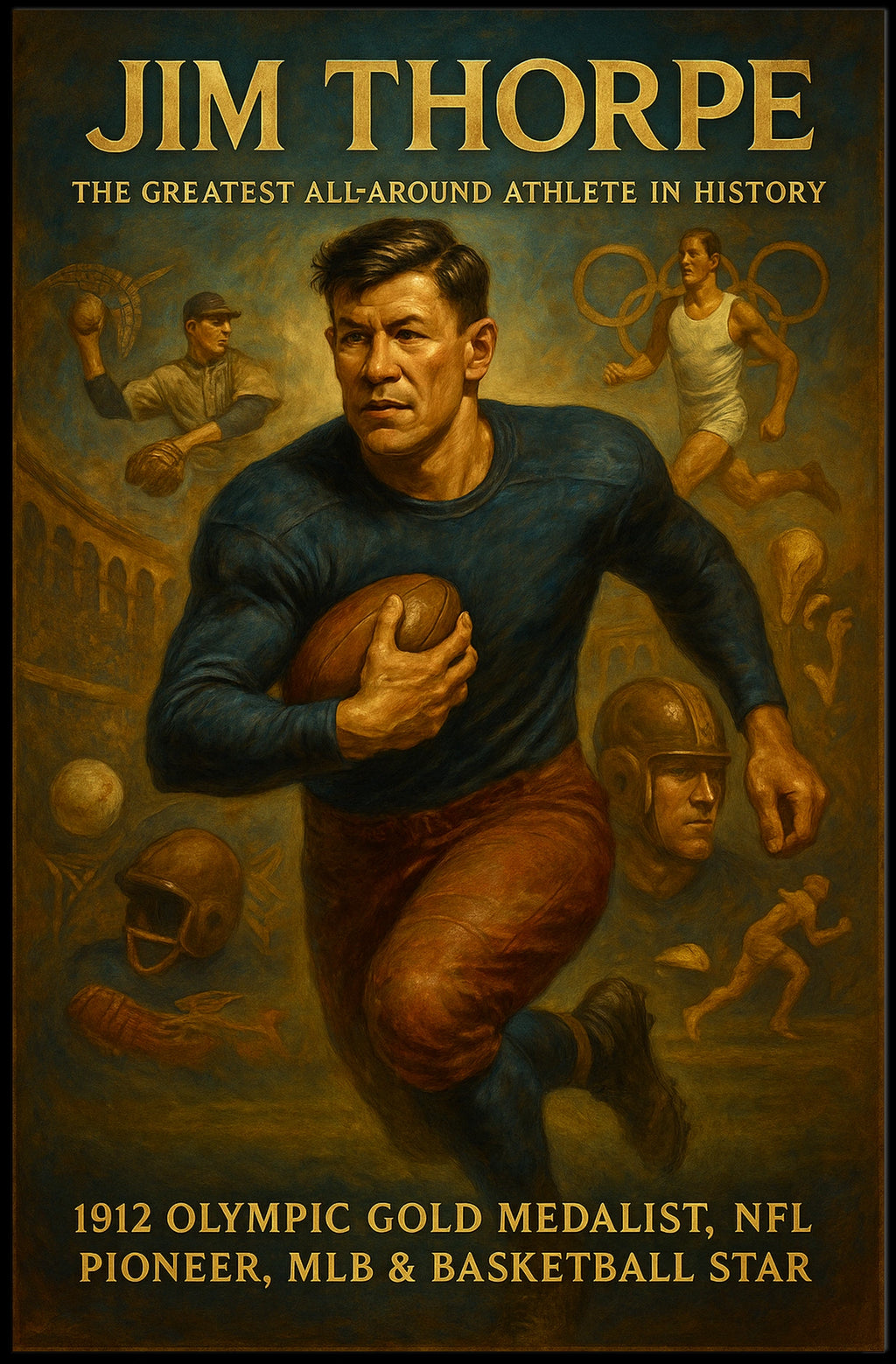 Iconic multi-sport portrayal— celebrates Thorpe’s Olympic gold medalist legacy, pioneering NFL talent, and MLB versatility, fueling pride in sports history.