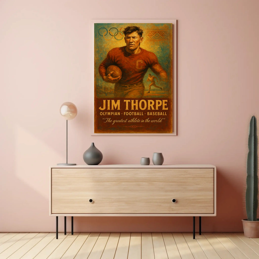 Iconic, multi-sport portrayal — honors Thorpe's versatility across football, track, baseball, and more for lasting inspiration.