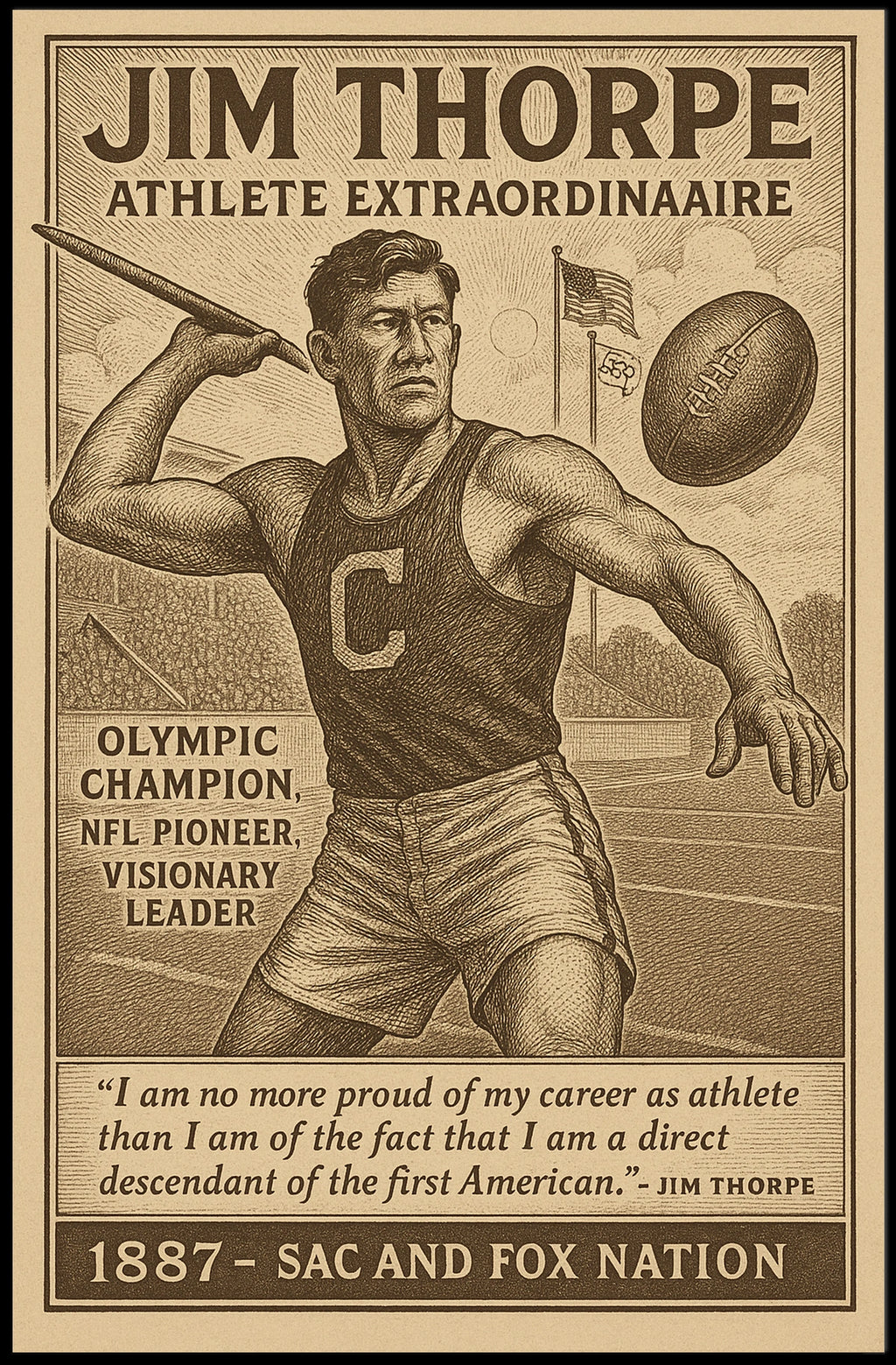 Celebrate the legacy of Jim Thorpe with this striking poster, a tribute to an Olympic champion and NFL pioneer. Rich in heritage and bold in design, it inspires sports fans and history lovers alike.