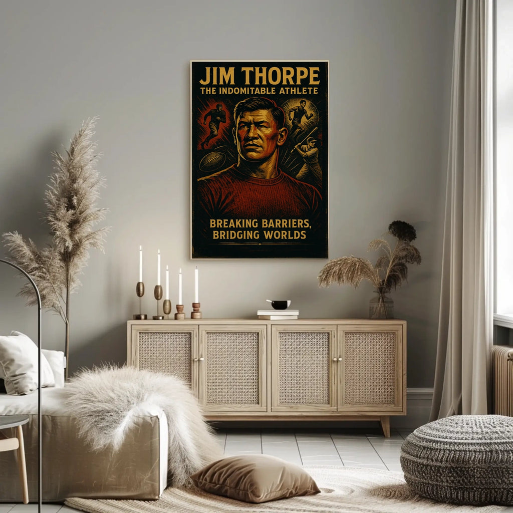 Celebrate the unparalleled legacy of Jim Thorpe with this vibrant poster. This inspirational art print honors a legendary athlete and his trailblazing achievements, bringing motivation, resilience, and sports history into any space—home, office, or gym.