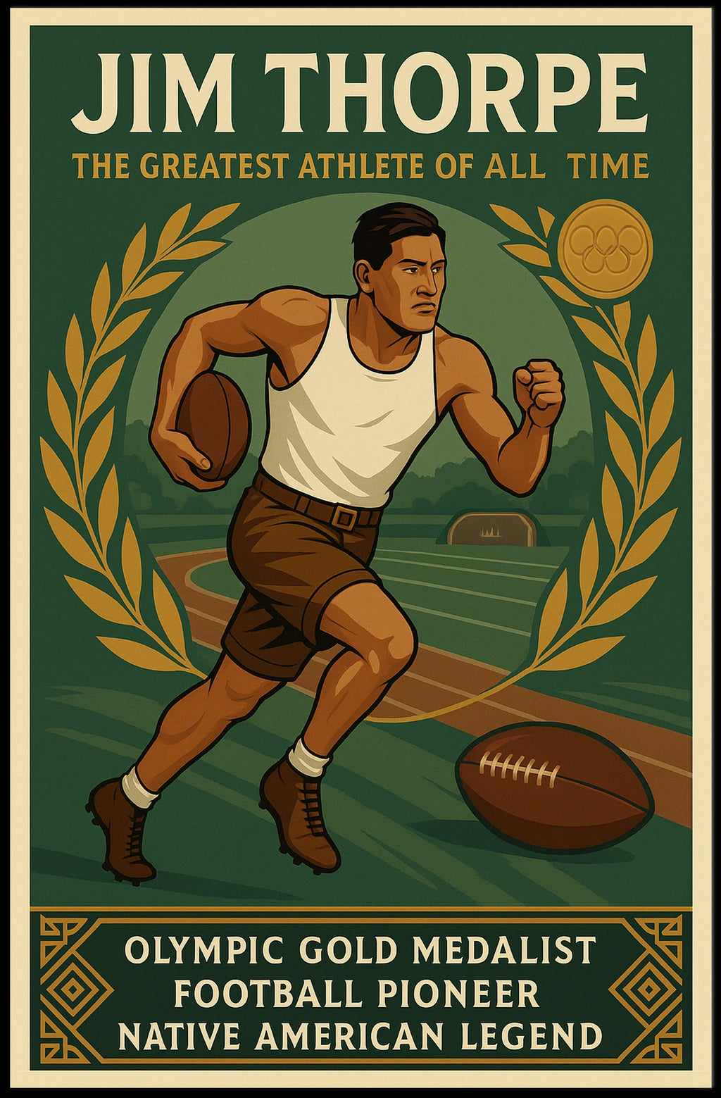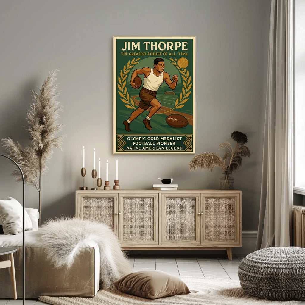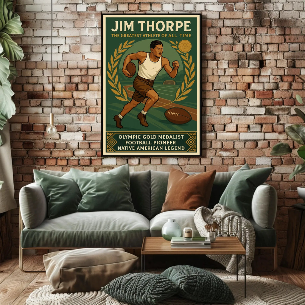 Celebrate the enduring legacy of one of history's greatest athletes with this Jim Thorpe poster. Rich in history and inspiration, it captures his Olympic gold, fearless football pioneer, and status as a Native American icon, making it a bold focal point for any room.
