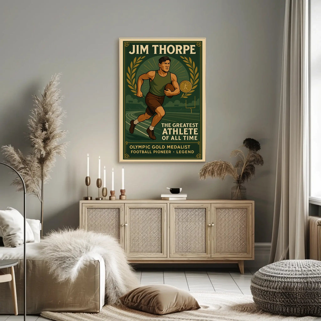 Celebrate the enduring legacy of Jim Thorpe with this striking poster. Designed for sports lovers and history buffs, it honors a true Olympic gold medalist and pioneering football icon. Bring a piece of athletic history into your space and spark daily inspiration to chase greatness.