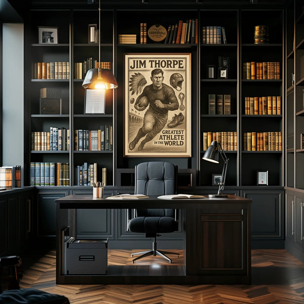 Celebrate the legacy of Jim Thorpe, one of the greatest athletes in history, with this vintage-style poster that blends sports history with bold, modern aesthetics. Designed for fans, collectors, and anyone who loves inspirational wall art, it highlights Thorpe's legendary speed, versatility, and trailblazing achievements, making it a compelling centerpiece for any space.