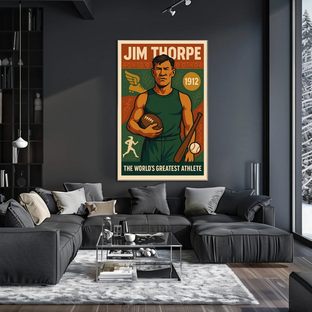 Celebrate the enduring legacy of Jim Thorpe with a vintage-inspired poster that captures the spirit of one of sports history's greatest icons. This striking artwork blends nostalgic design with bold symbolism, turning any wall into a tribute to athletic greatness and everyday ambition.