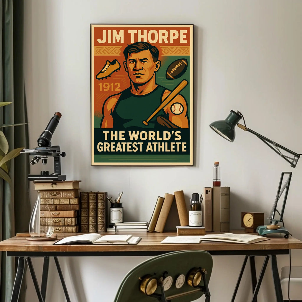 Own a piece of sports history with this poster that honors Jim Thorpe's enduring legacy and universal appeal. Perfect for any space that inspires greatness, it invites conversation and admiration. Ready to elevate your decor and celebrate excellence? Shop now and add this iconic tribute to your collection.