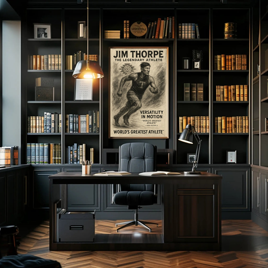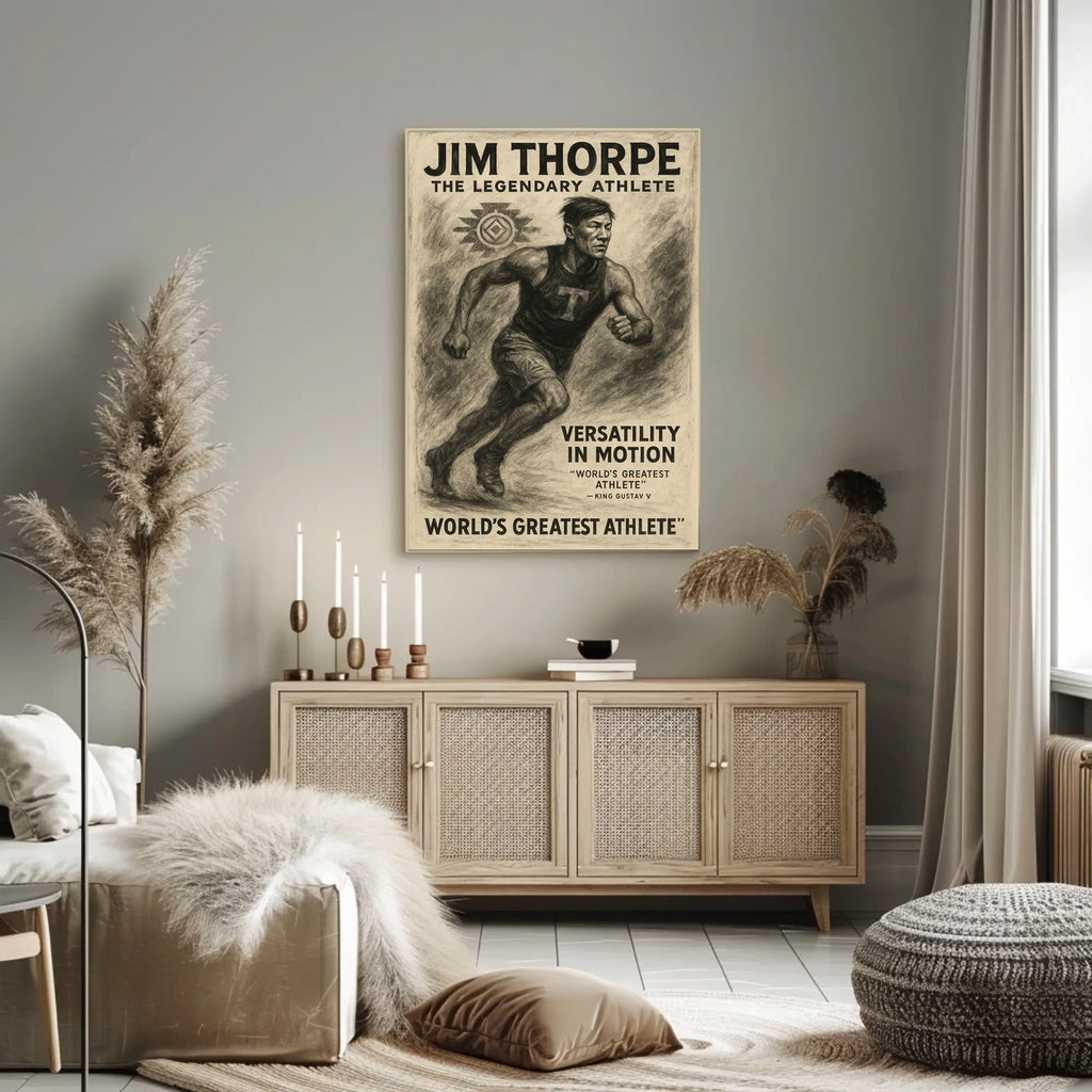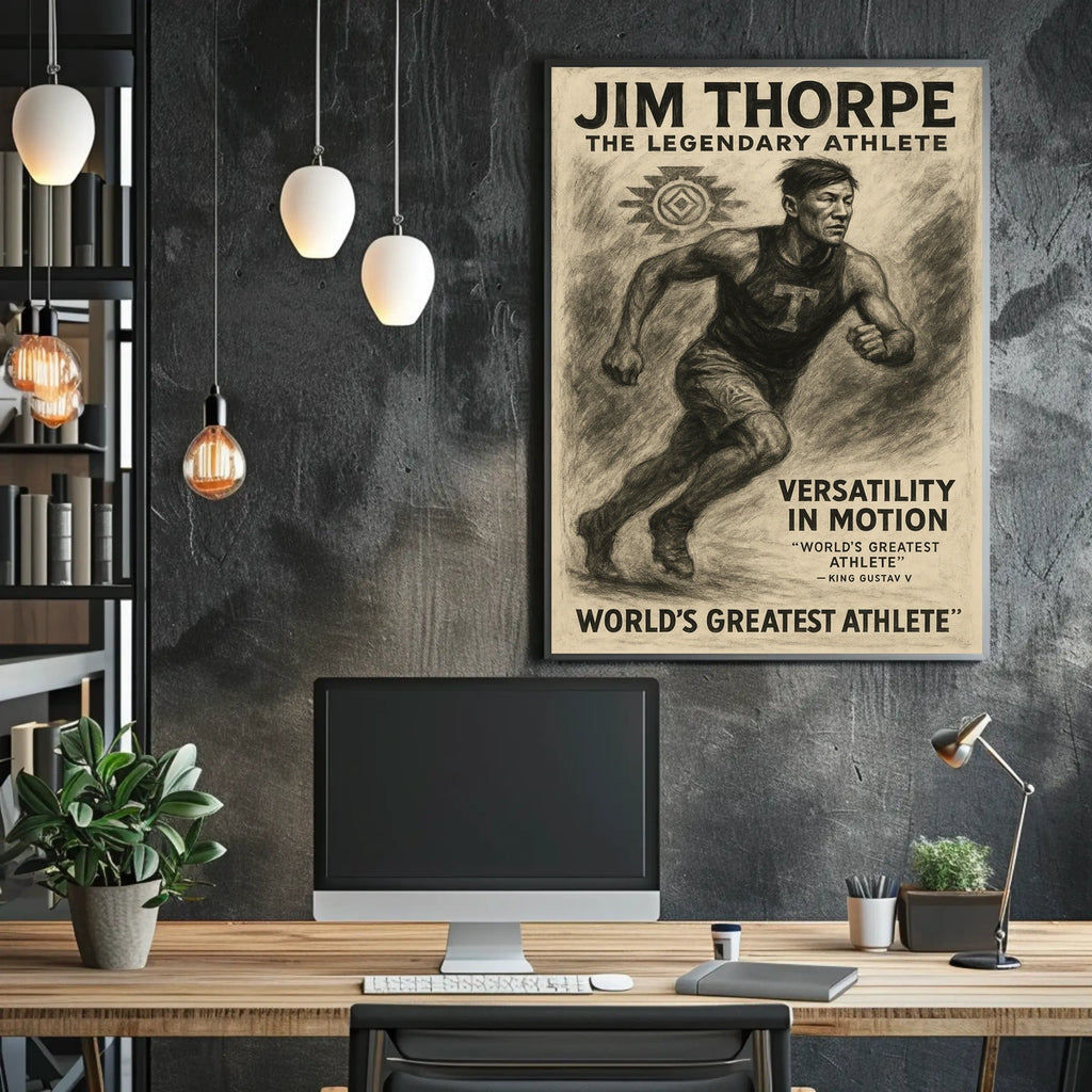 Own a piece of sporting history with this Jim Thorpe poster. It blends art and legacy to create a focal point that motivates, educates, and inspires. Add to cart today to celebrate athletic inspiration, historical sports art, and the legend of a true athlete.