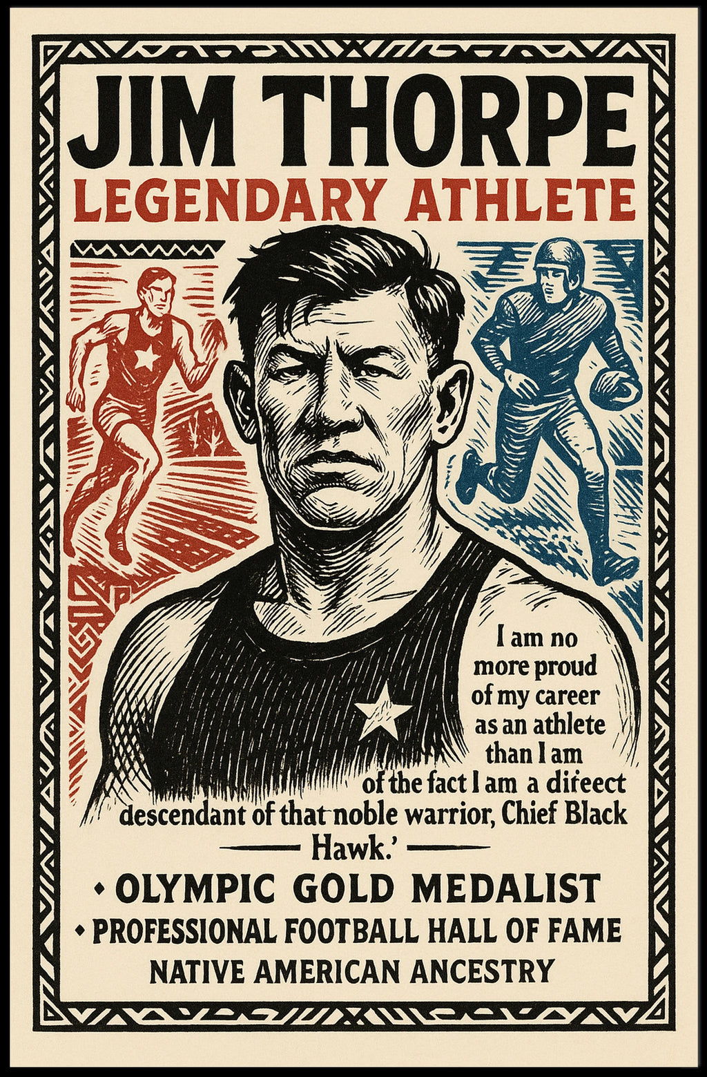 Celebrate the unparalleled legacy of Jim Thorpe with this vibrant poster, a tribute that appeals to sports fans and history buffs alike. Rich in color and context, it highlights Thorpe’s Olympic triumphs and his lasting impact on American sports culture.