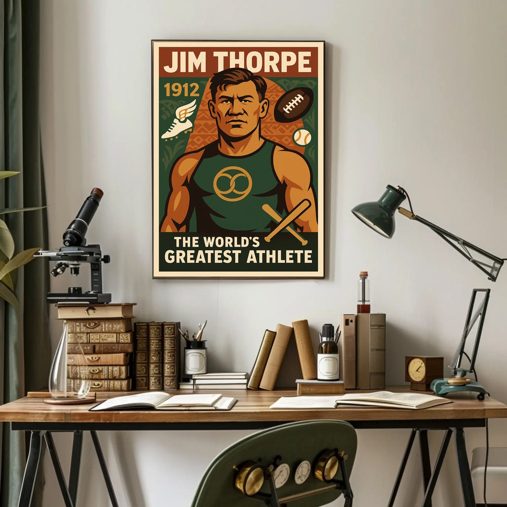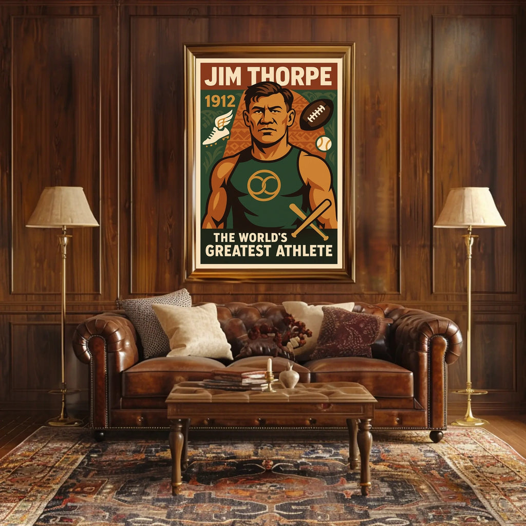 Celebrate Jim Thorpe's legendary versatility and Olympic triumphs with this vintage-style poster. Designed for sports history enthusiasts, it honors one of the era's greatest athletes while adding a bold, collectible accent to any room.