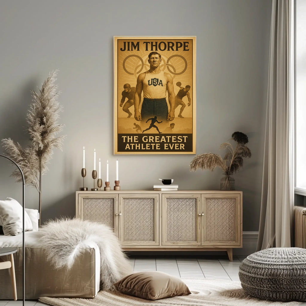 Celebrate the legacy of Jim Thorpe with a vintage-style poster that blends history with bold, contemporary display appeal. This artwork honors athletic achievements and the enduring impact of one of the greatest athletes in sports history, making it a standout centerpiece for any room.