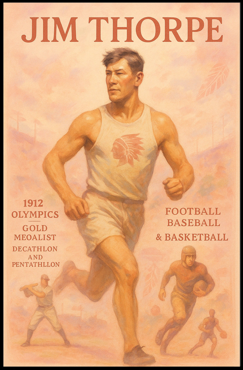 Iconic multi-sport legacy captured in a bold print—celebrates Thorpe’s versatility and motivates excellence across disciplines.