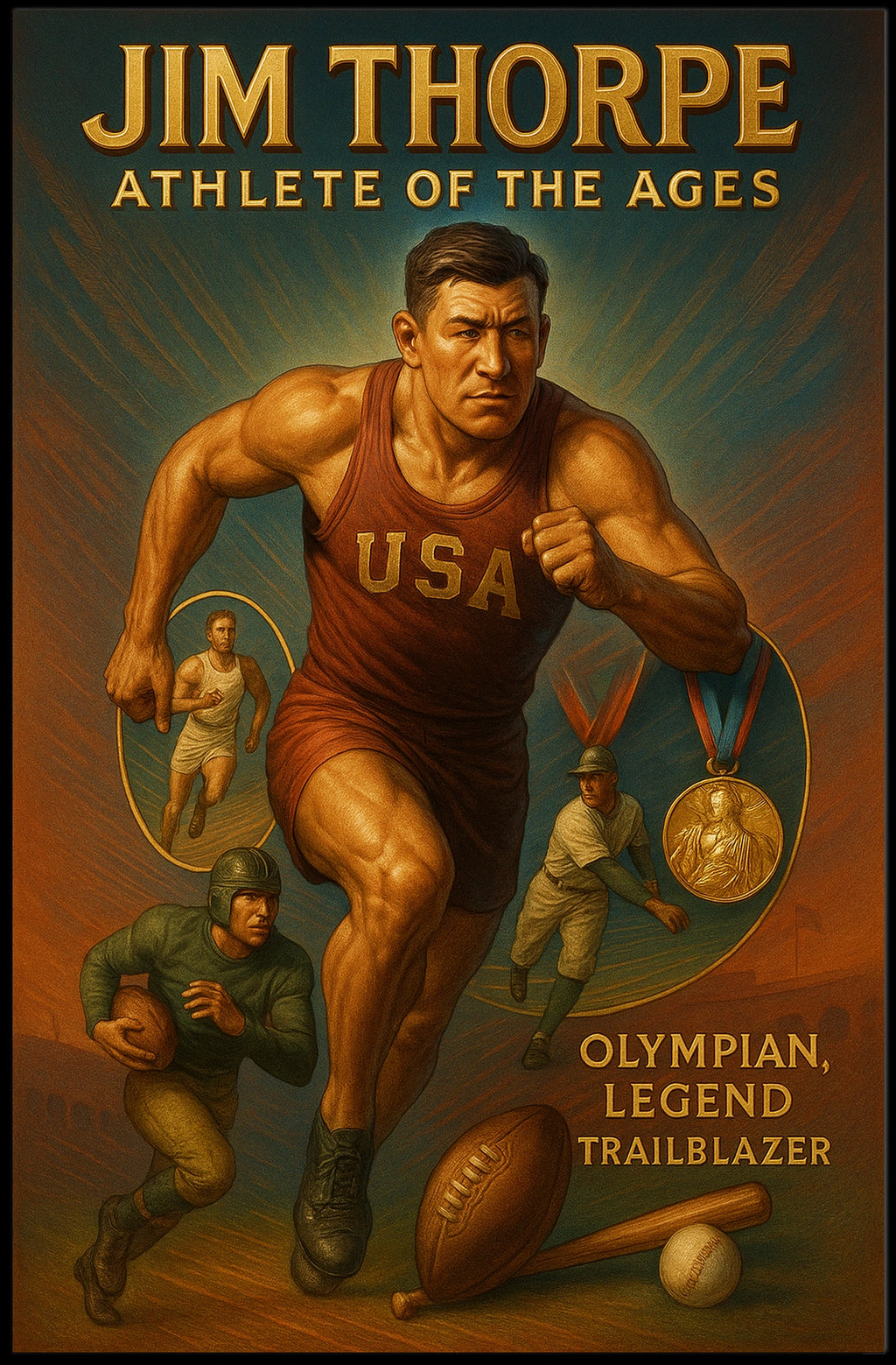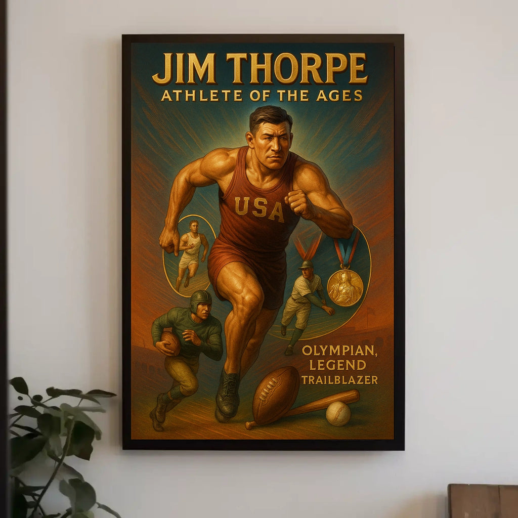 Celebrate the unparalleled achievements of Jim Thorpe with this stunning poster. Perfect for sports enthusiasts and history buffs, it highlights his extraordinary versatility and lasting influence in athletics. Enhance your space with a tribute to one of the greatest athletes of all time.