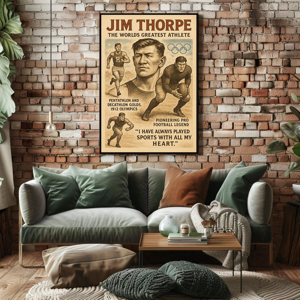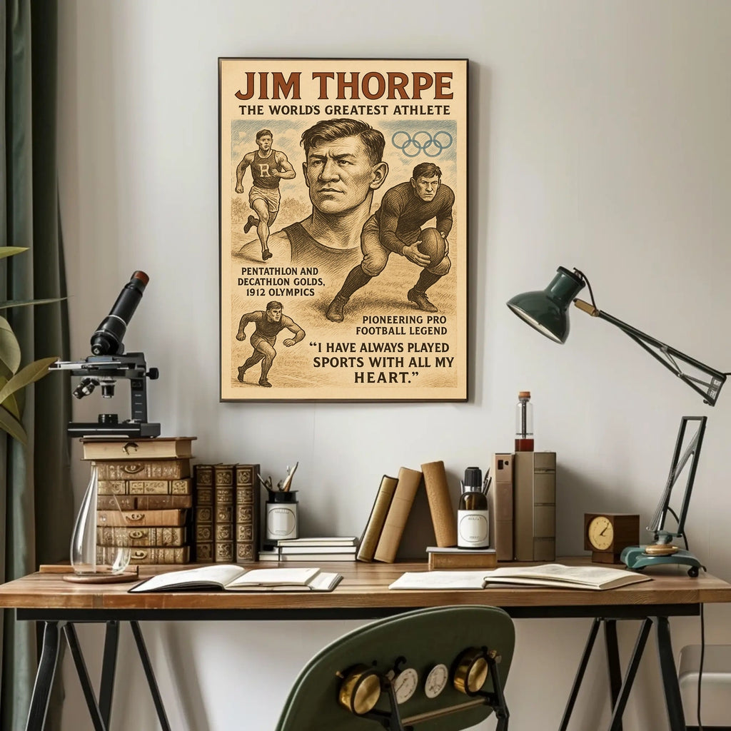 Celebrate the legend of Jim Thorpe with this striking poster devoted to the world's greatest athlete. From his breathtaking triumphs at the 1912 Olympics to his pioneering professional football career, this art prints a powerful story of grit, versatility, and historic achievement—perfect for fans of sport, history, and motivation.