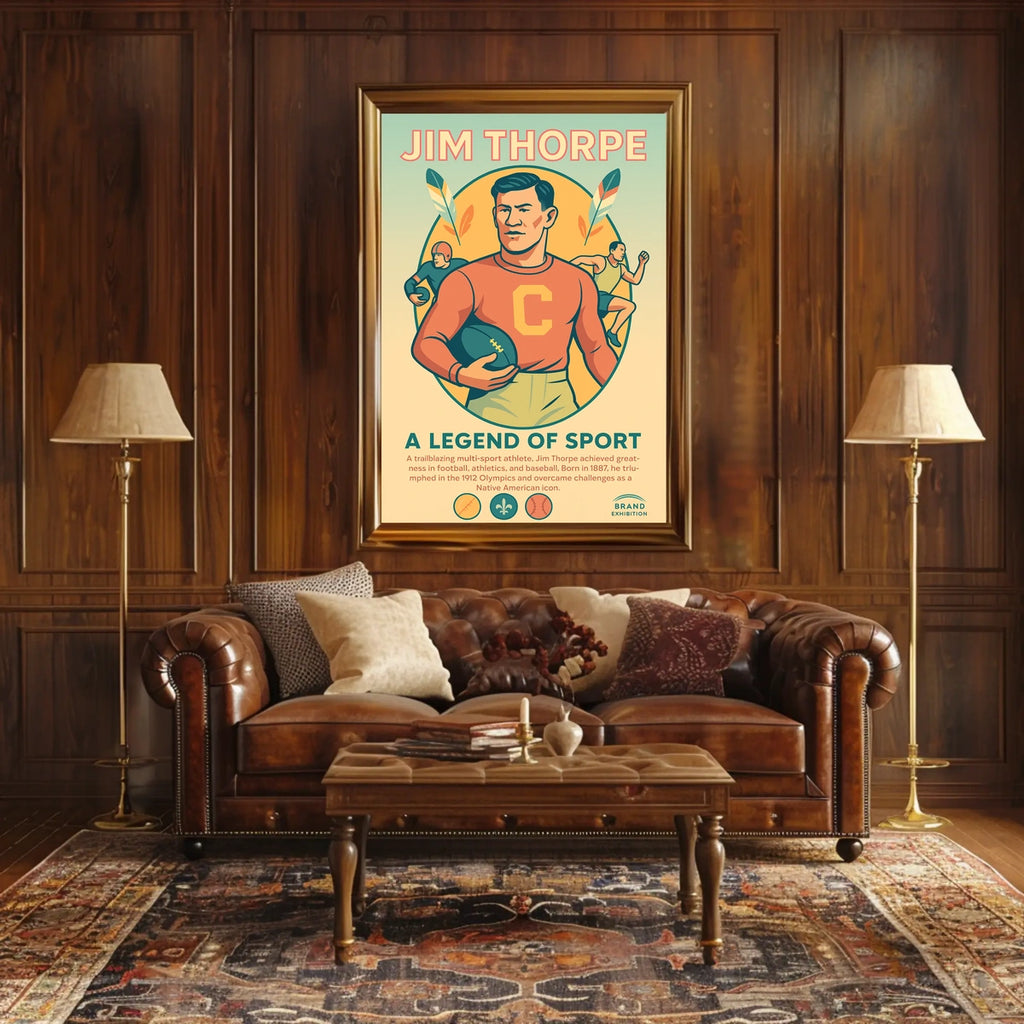 Celebrate the enduring legacy of Jim Thorpe with this iconic sports poster. It highlights his dominance across football, track and field, and baseball, while spotlighting his Olympic glory and groundbreaking role as a Native American icon. Perfect for fans of sports history and cultural achievement, this poster adds inspiration to any room.