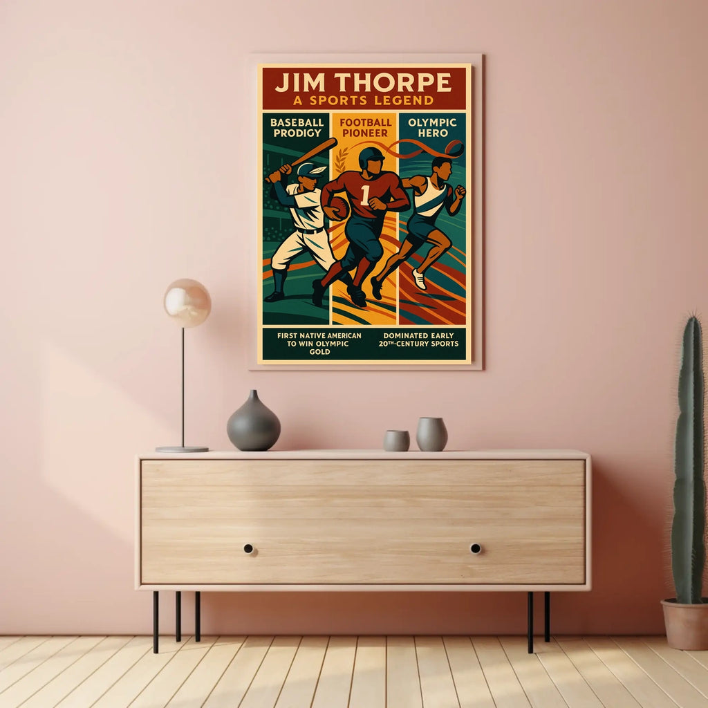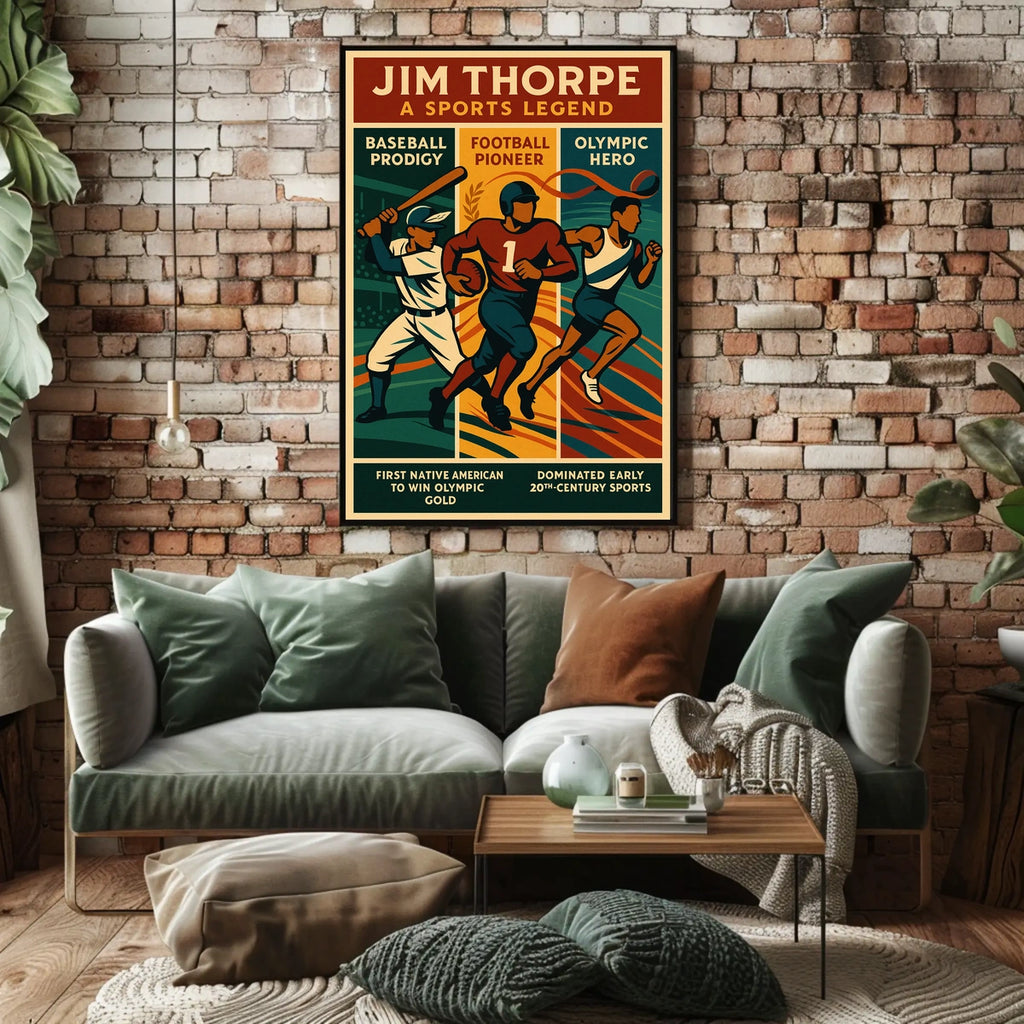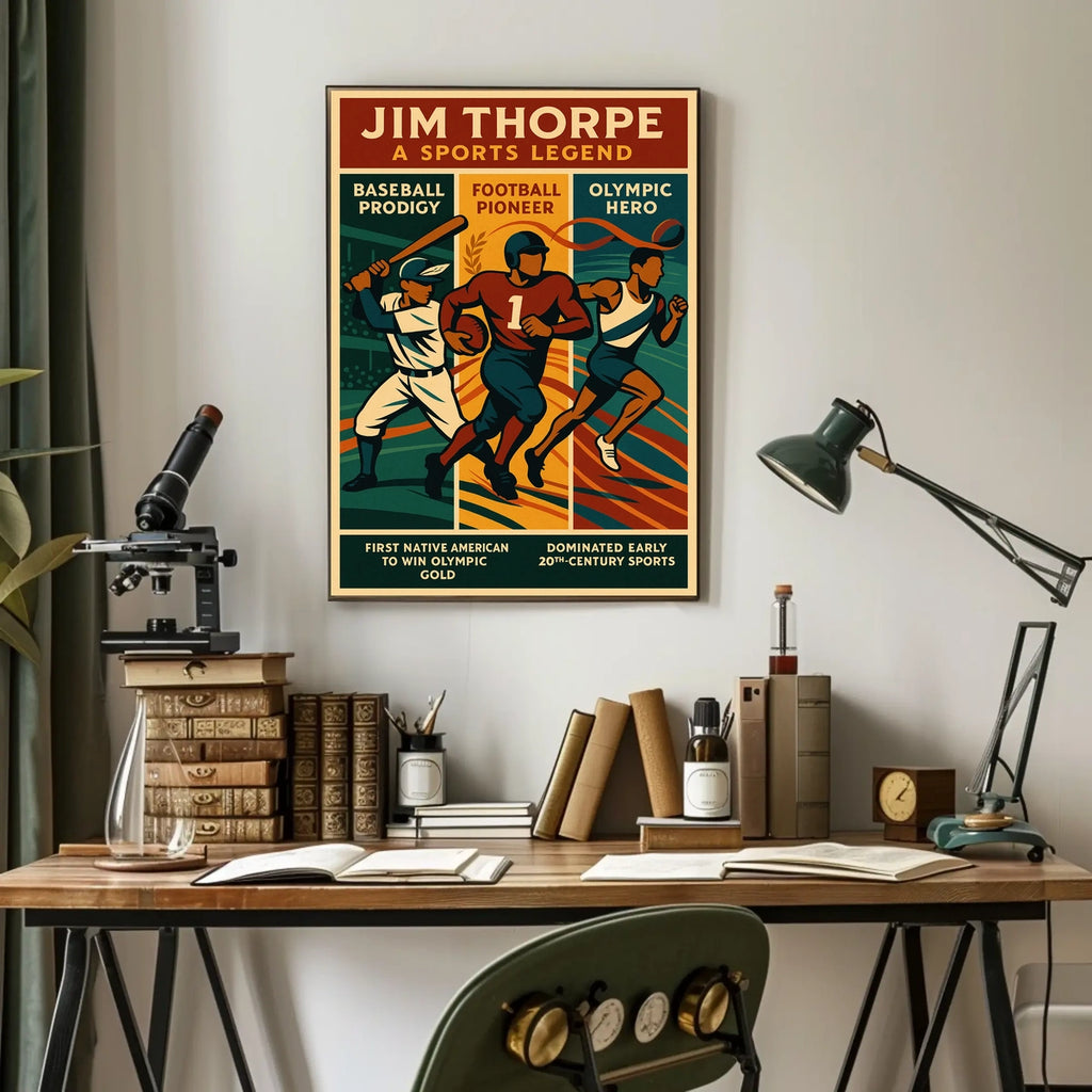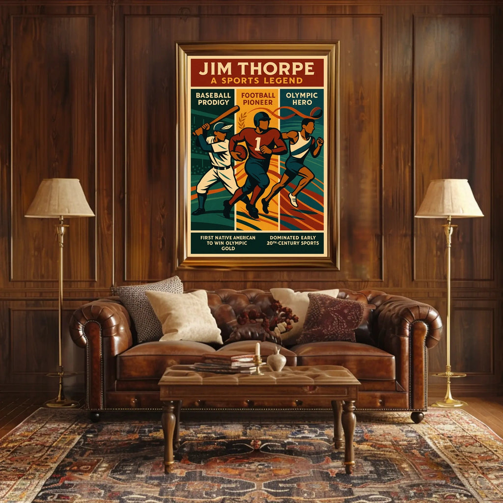 Celebrate the enduring legacy of Jim Thorpe with this striking poster that honors his Olympic triumphs and trailblazing roles in baseball and football. Designed for sports fans and history lovers, it captures Thorpe's fearless energy, versatility, and pioneering spirit, turning a powerful story into a bold wall statement.