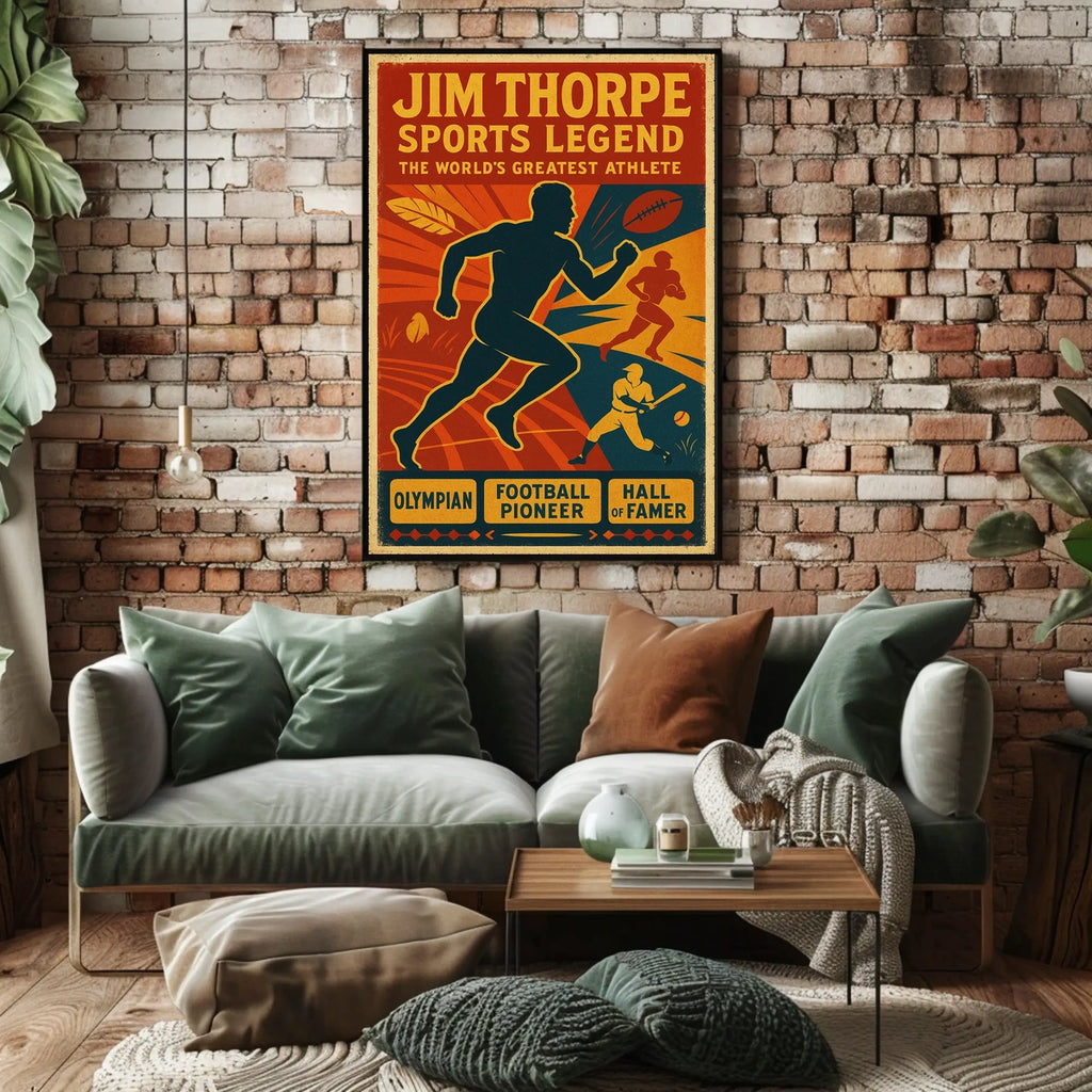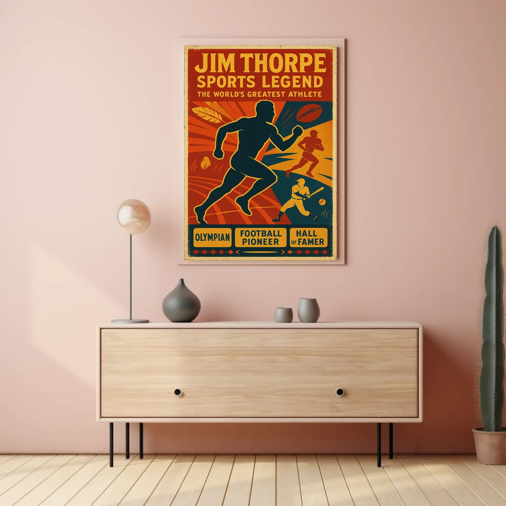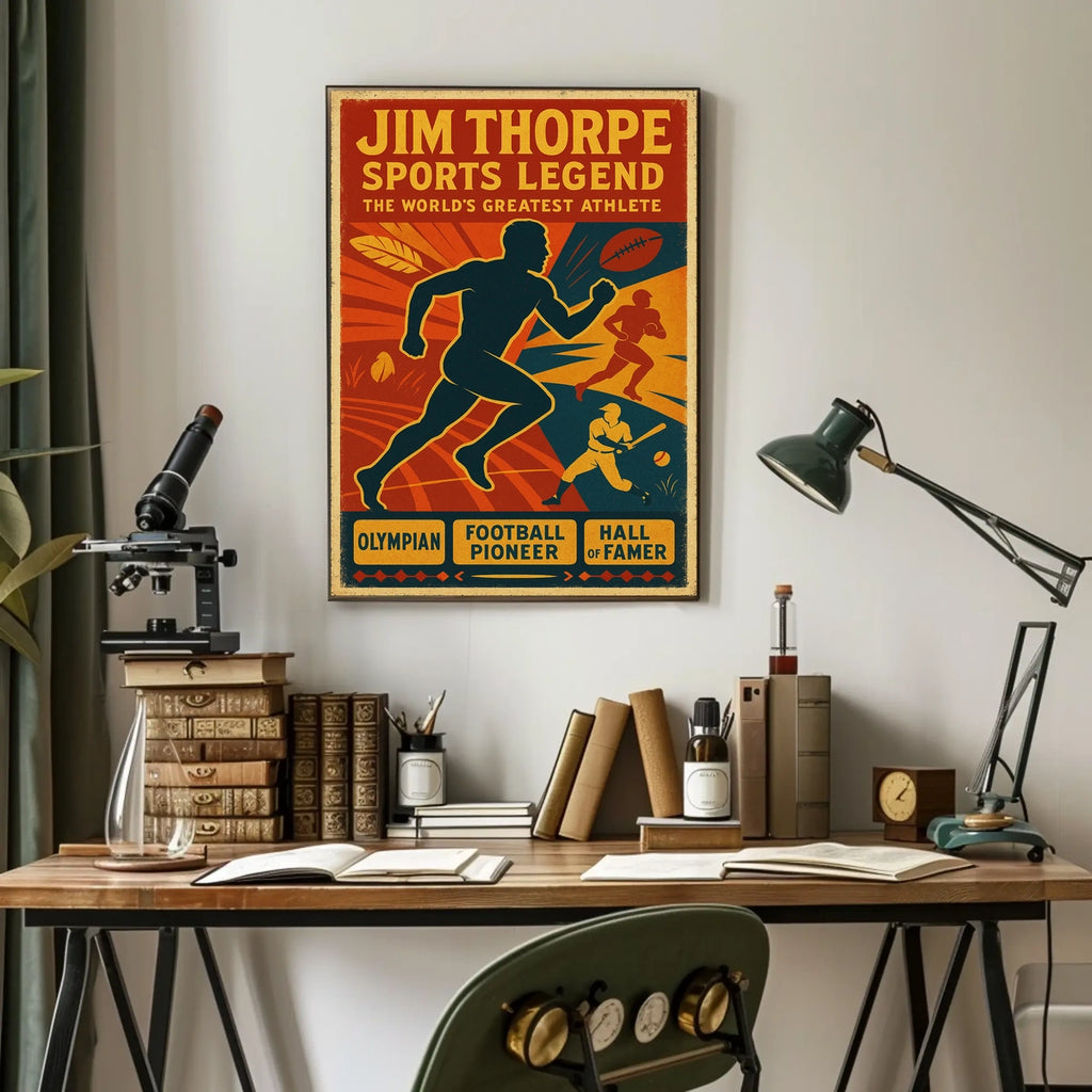 Celebrate the legacy of Jim Thorpe, hailed as the world's greatest athlete. This vibrant poster honors his achievements as an Olympian, football pioneer, and Hall of Famer, delivering sports history you can proudly display in any space.