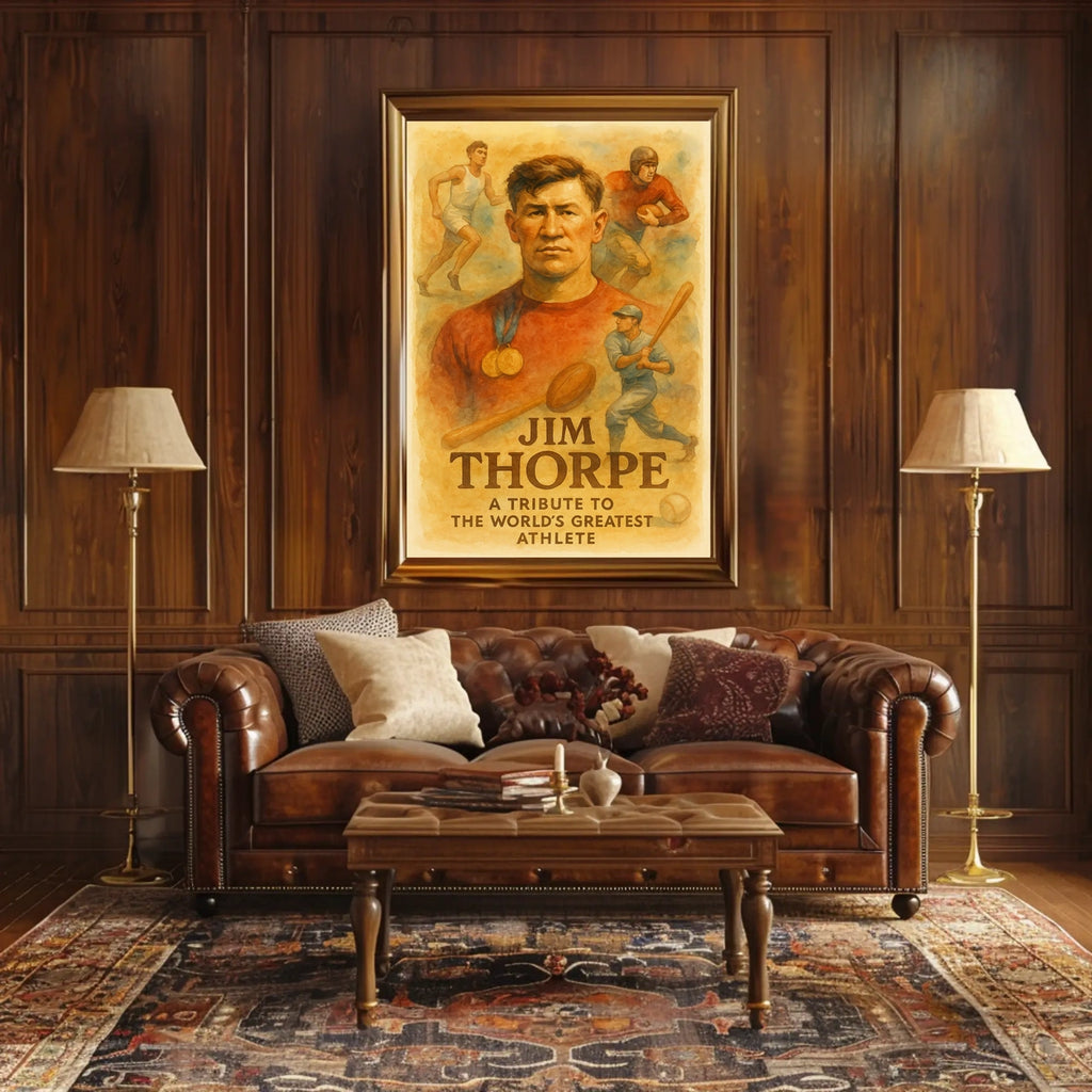 Celebrate the enduring legacy of one of athletics' greatest icons with this Jim Thorpe Celebrating a Sports Legend Poster. This vibrant tribute blends history and inspiration, spotlighting Thorpe’s dominance across track and field, football, and baseball to energize any space. Perfect for sports history enthusiasts, classrooms, or workspaces, it sparks conversation and motivation every day.