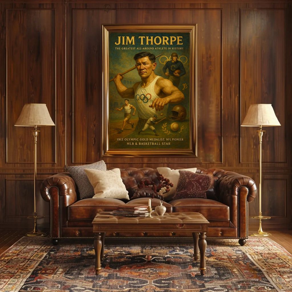 Iconic tribute to a multi-sport legend — highlights Thorpe’s Olympic gold and trailblazing impact across major leagues, elevating any space with historic inspiration.