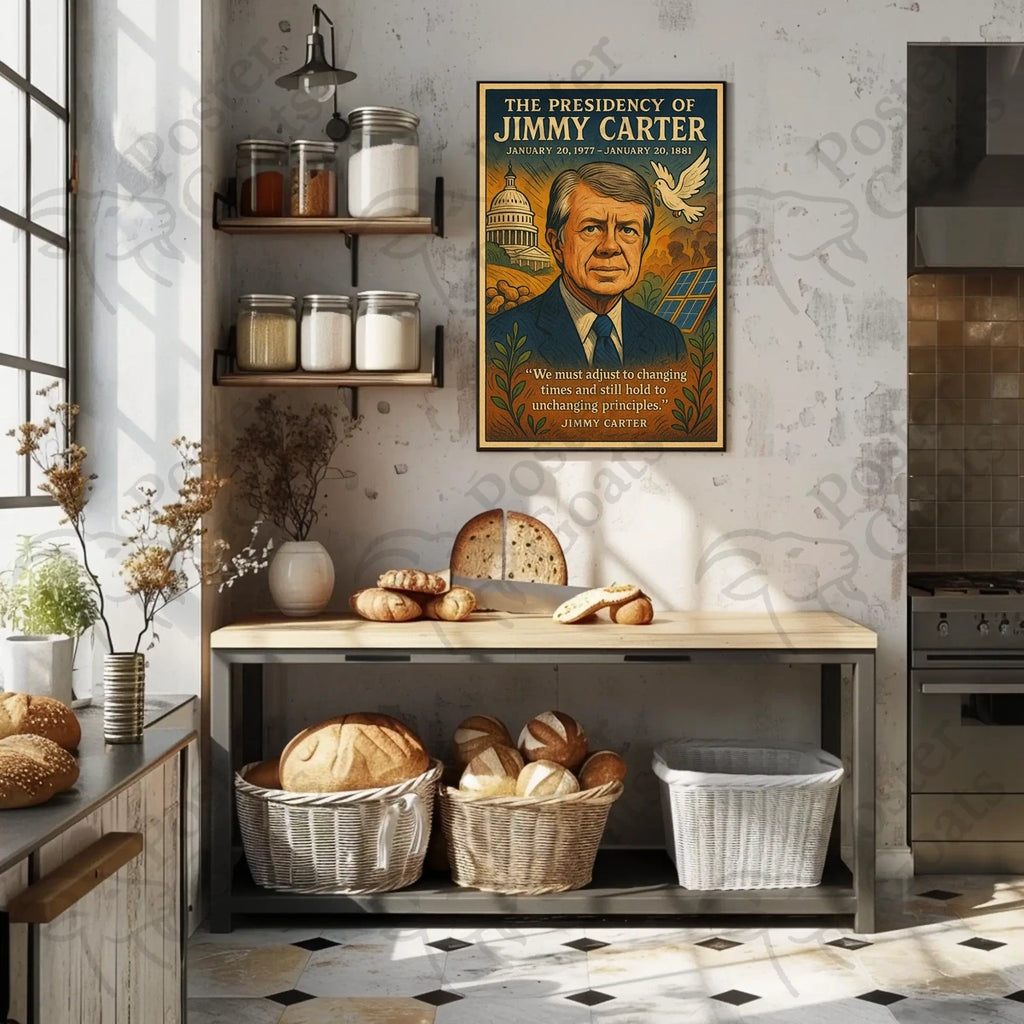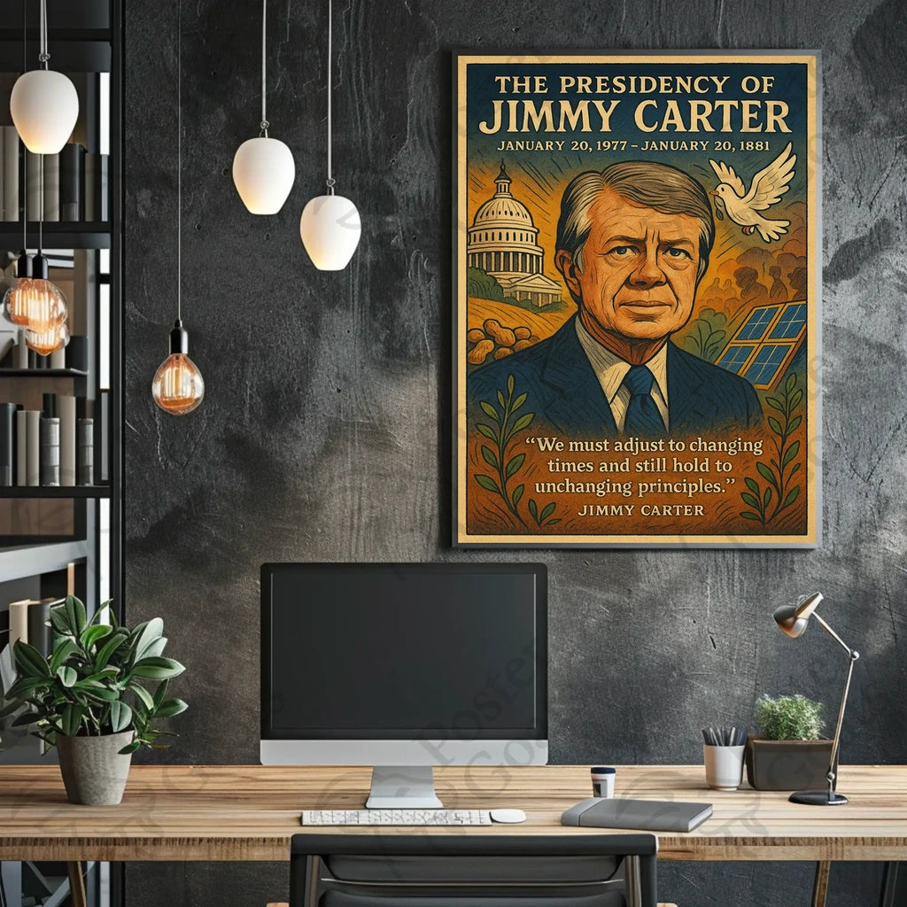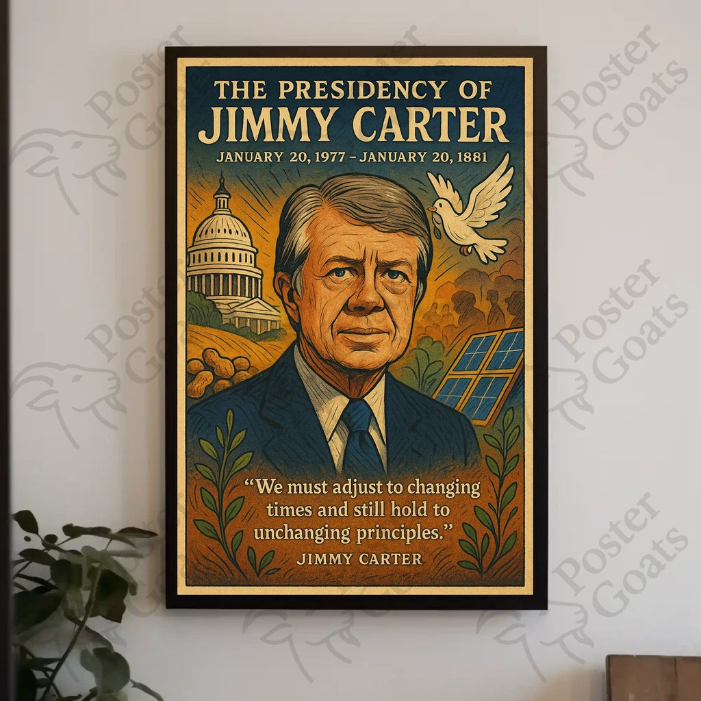 Experience the reflective journey of Jimmy Carter's presidency from 1977 to 1981 through this beautifully crafted poster. Showcasing a vintage, illustrative style, it uses earthy tones to create a historical and patriotic atmosphere. The central focus is on Carter himself, depicted with a serious demeanor, while symbolic backdrops such as the U.S. Capitol building, a peace-invoking dove, and solar panels convey his political priorities and environmental focus. Surrounding elements like peanut plants and human silhouettes highlight his agricultural roots and public connection, bringing depth and richness to the composition. This poster is a tribute to principled leadership and core values.
