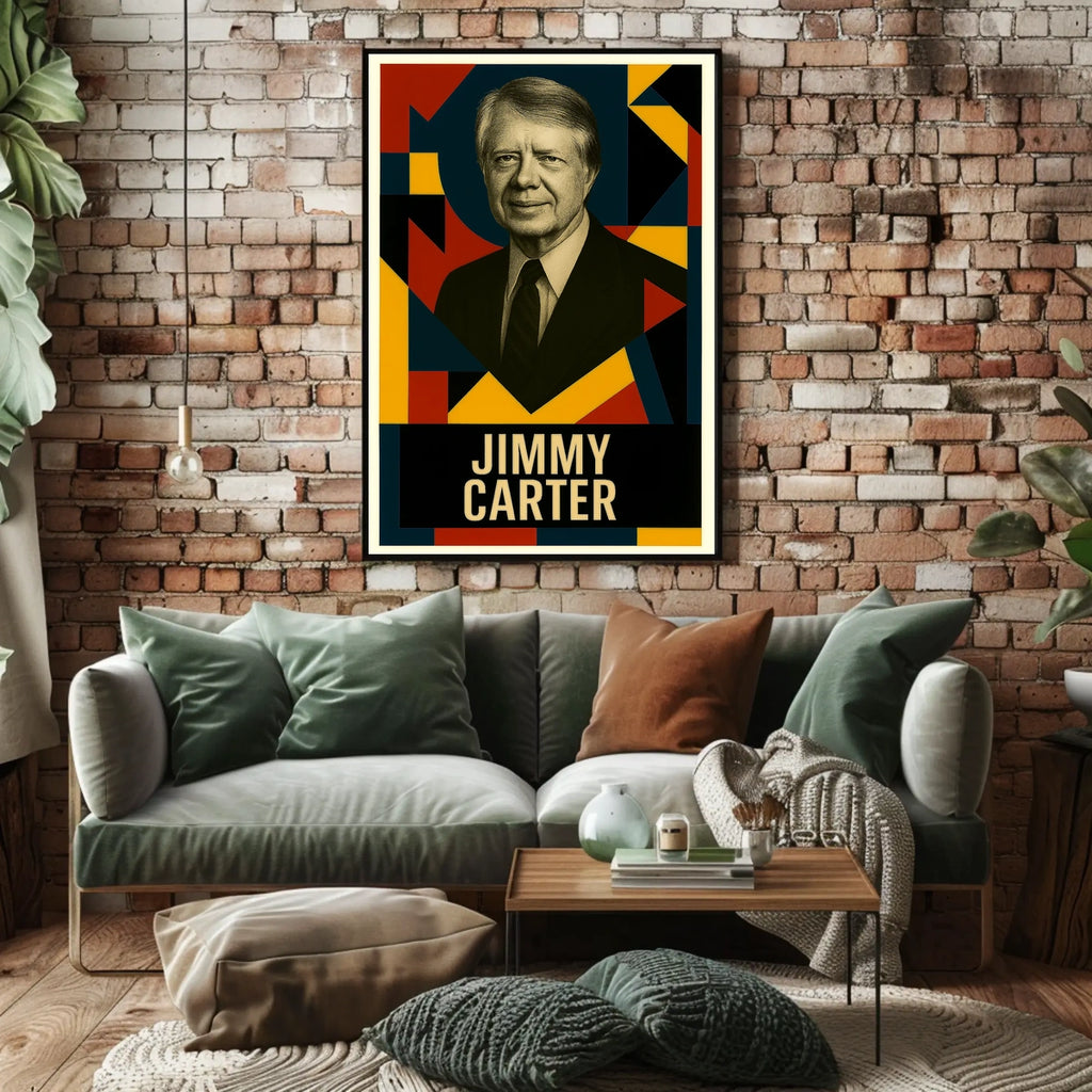 Jimmy Carter 39th President of the United States Abstract Pop Poster shows a portrait in a pop-art design. Designed as wall art for homes and offices, it adds a historical reference to a room. The poster uses shapes and color to create a visual element on a wall. It communicates interest in American history and politics without clutter. It is intended for display as part of a wall gallery and works with standard poster framing and decor styles. Add this poster to your space for a visual statement.