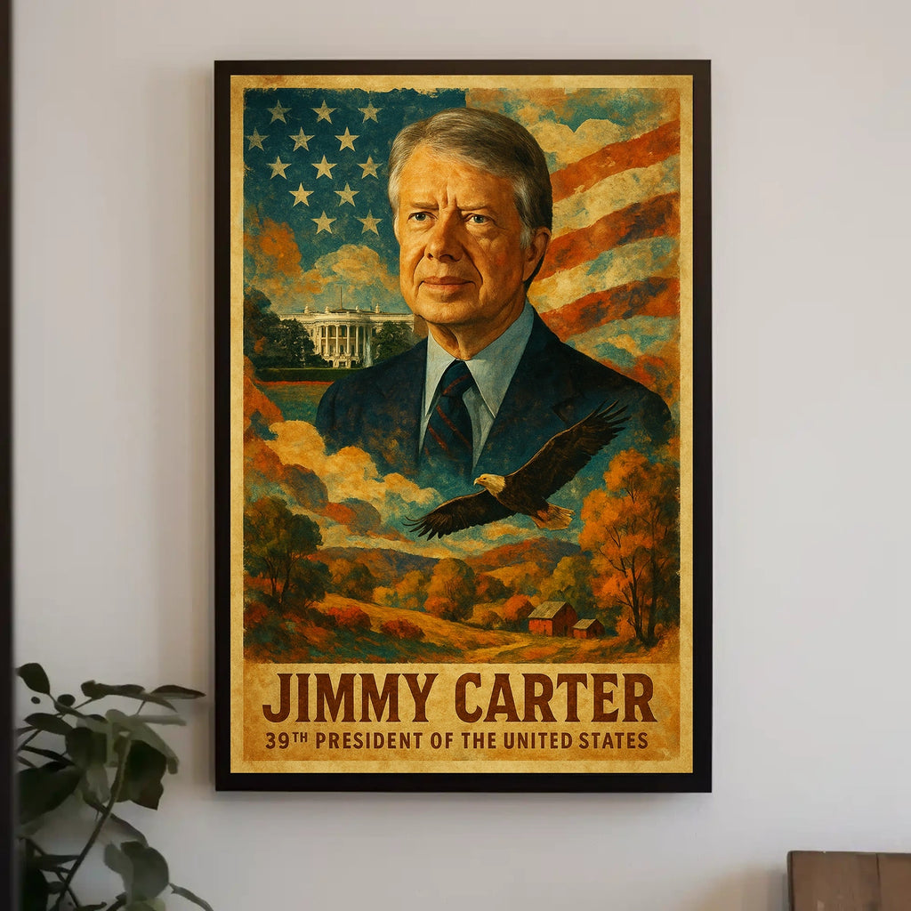 Celebrate American history and leadership with this layered digital collage poster of Jimmy Carter, the 39th President of the United States. Crafted for history enthusiasts, political aficionados, and fans of bold wall art, it blends a contemporary collage with classic portrait sensibilities.