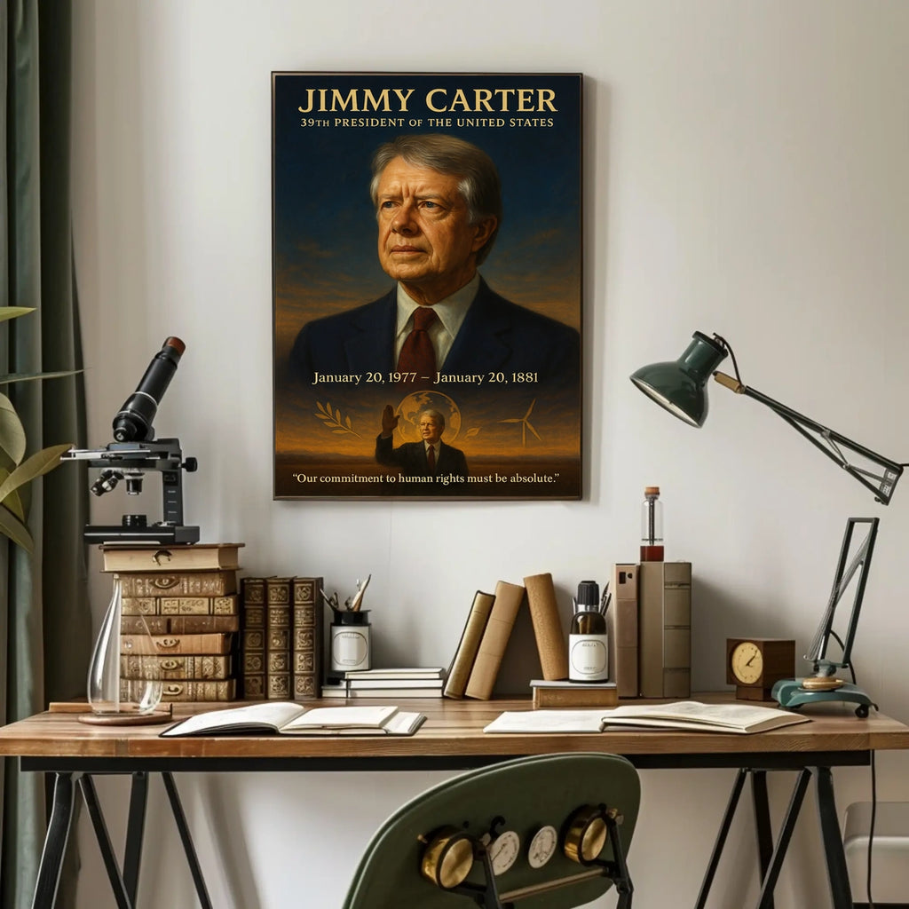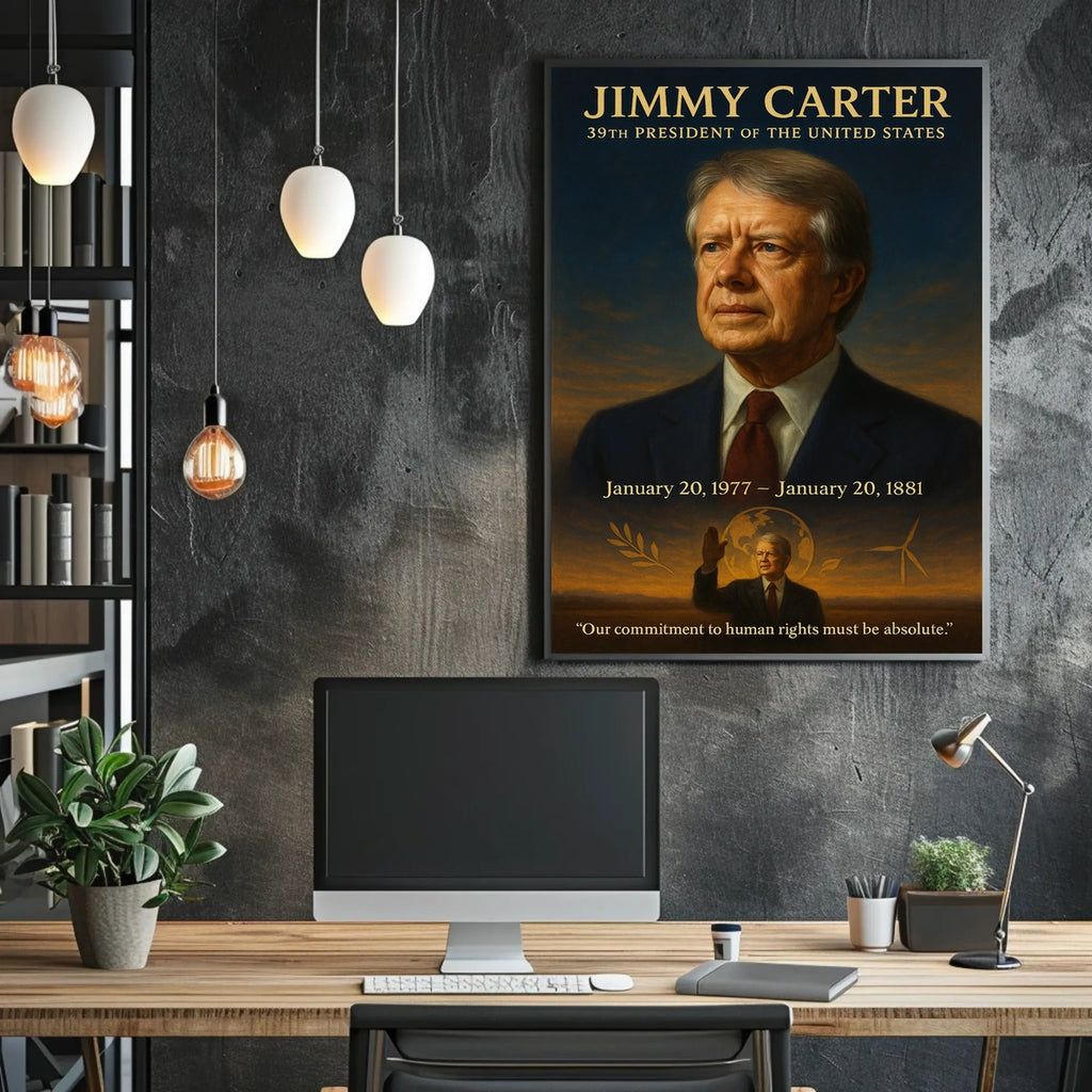 This poster captures the essence of Jimmy Carter's presidency with scenic visuals that evoke curiosity and wanderlust, making it a versatile decor piece for living rooms, bedrooms, or offices.